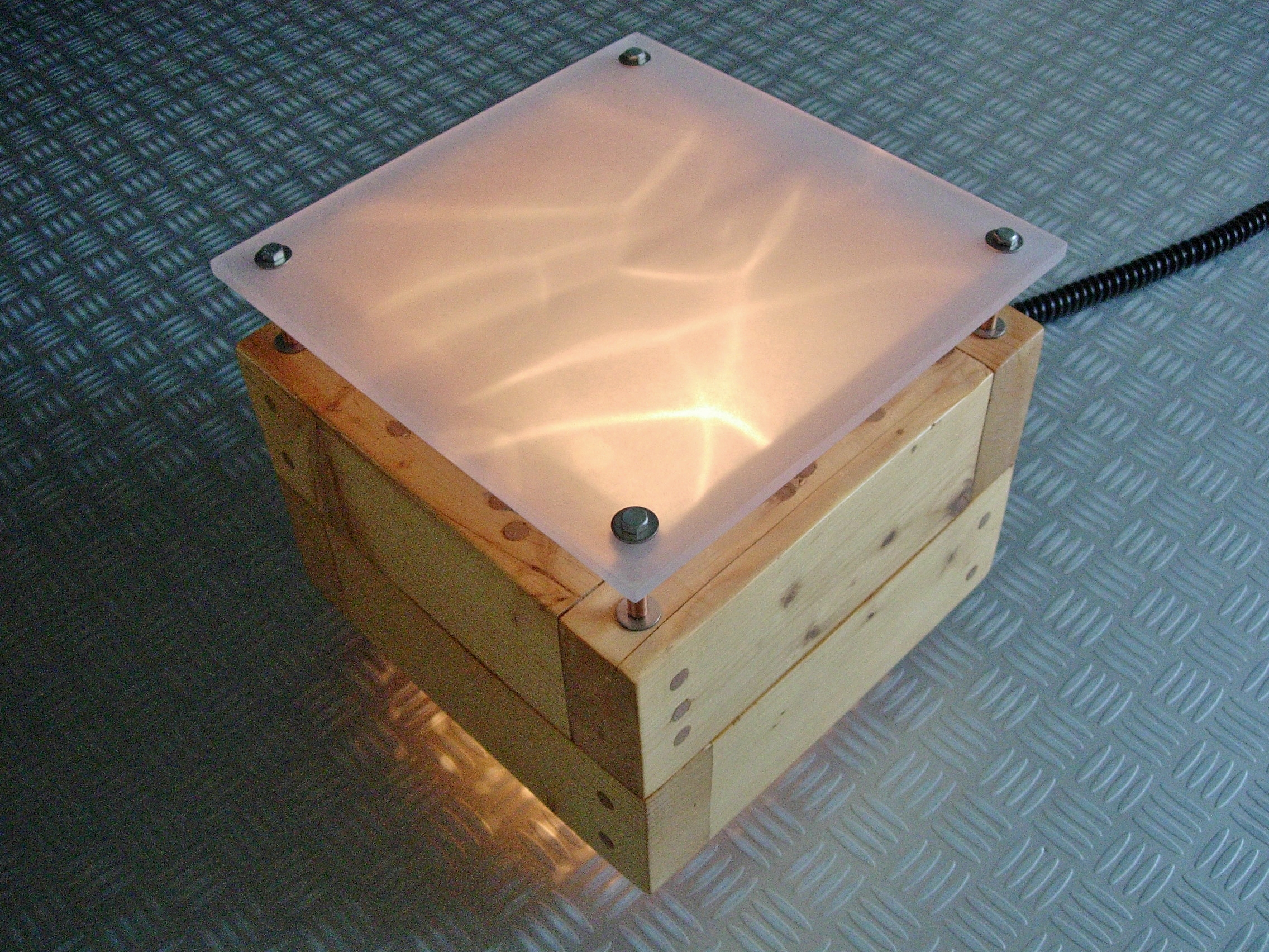 "Blok" Staand lichtobject gemaakt van hout, glas, kunststof, diverse materialen zwakstroom