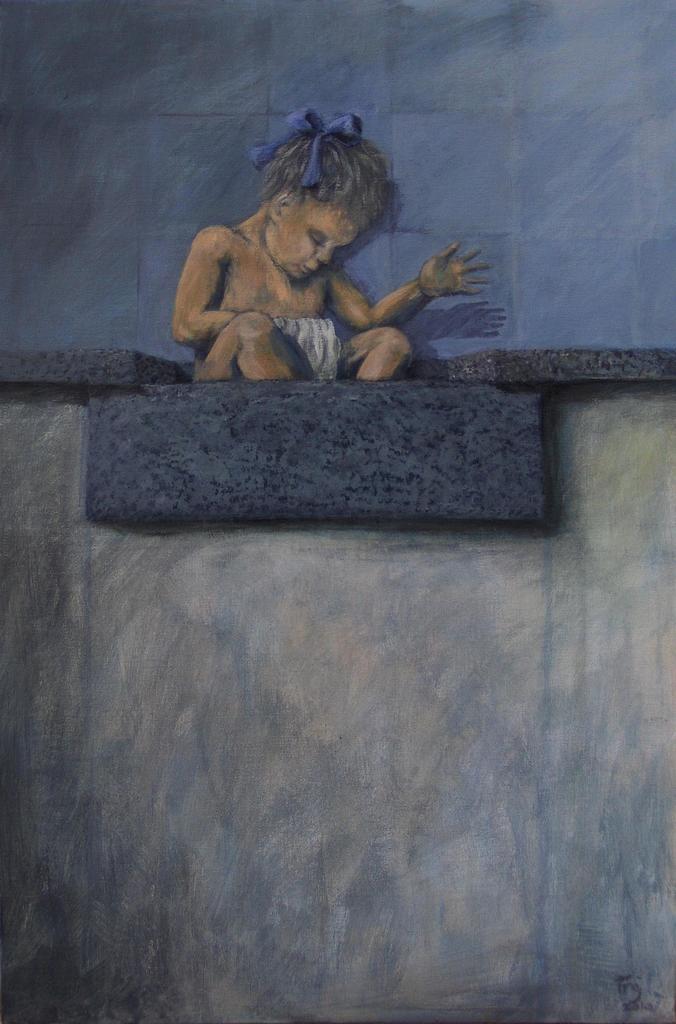 De kwetsbaarheid van een klein meisje in een gootsteen in bad benadrukt door de leegte eromheen en de hoogte