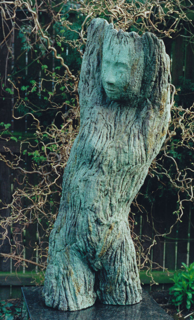 Een boomstam die deels torsachtig is met een gezicht, als een bosgod, een faun, maar dan vrouwelijk, vandaar de naam fraun