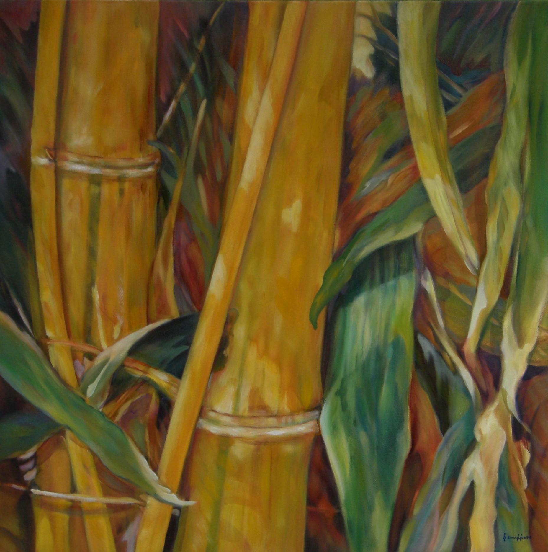Een levendig stilleven van de gele bamboe, waarin ritme en licht samenvloeien tot een gouden weefsel van natuur. De stengels en bladeren vormen een dans van herhaling en textuur, als een echo van tropische rust en kracht.