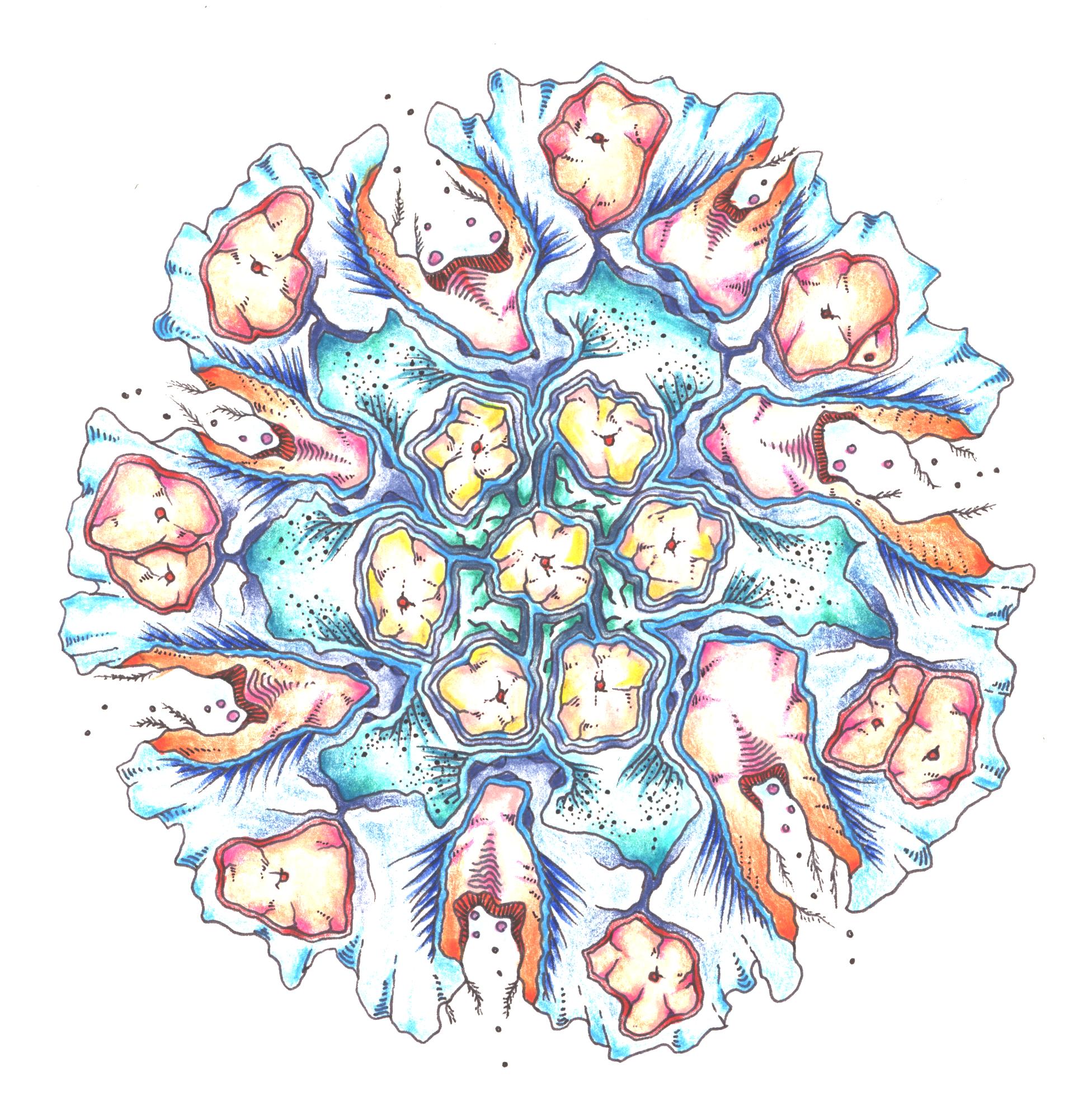 Uit de lijnen en de kleuren ontstaan een haast levend organisme. Ik zie het zich voortbewegen en voedsel zoeken met de vele monden aan de buitenkant.