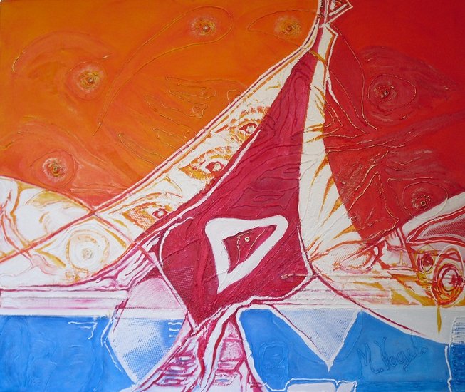 Levendig meerkleurig schilderij op doek.