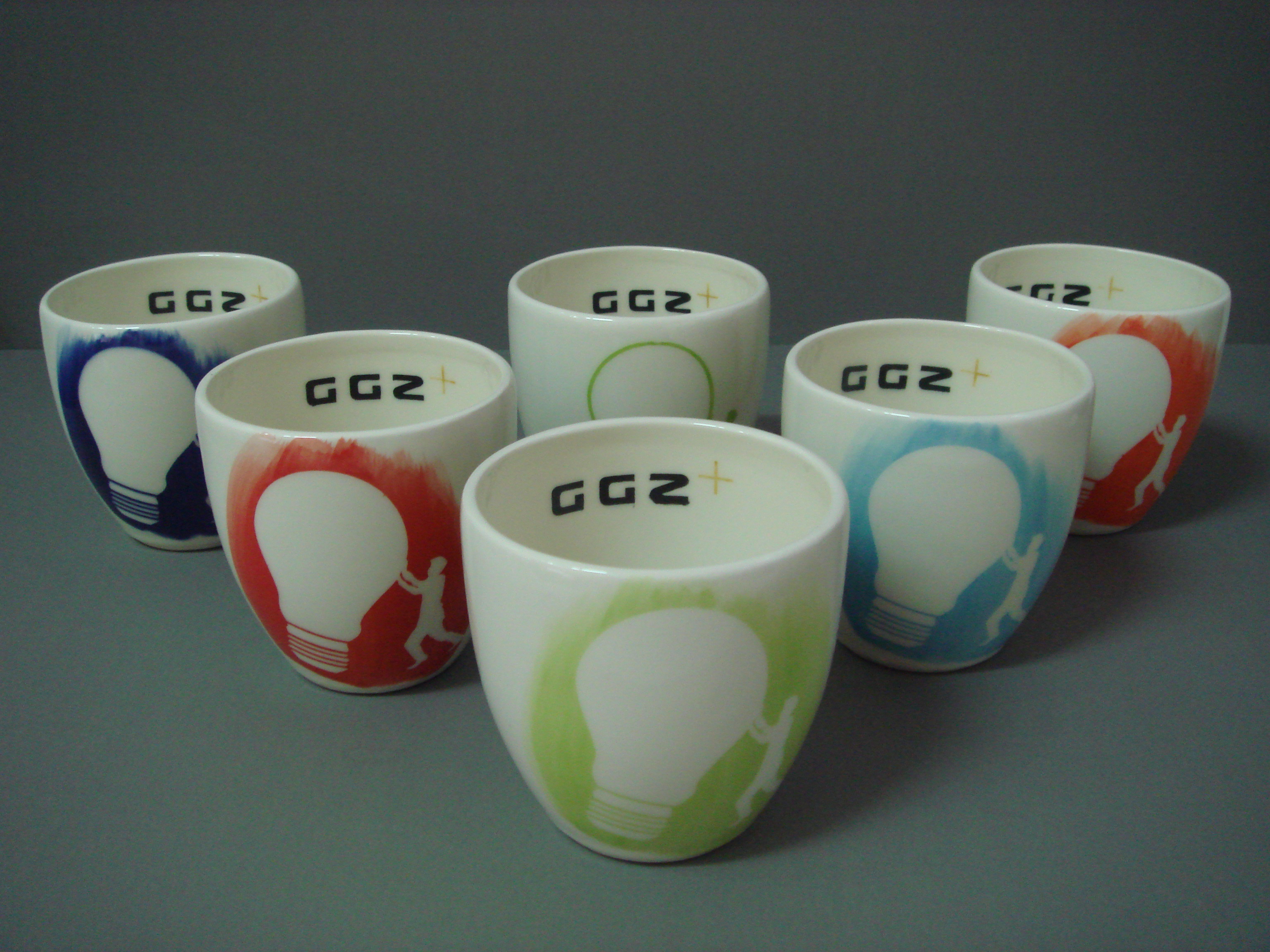 Bekers Beker Ggz+ Aardewerk Klei Glazuur Rood Blauw Groen Bruin Oranje Lichtblauw Petrol Logo Bedrijf Bedrijfslogo Gedecoreerd Decoratie Serie