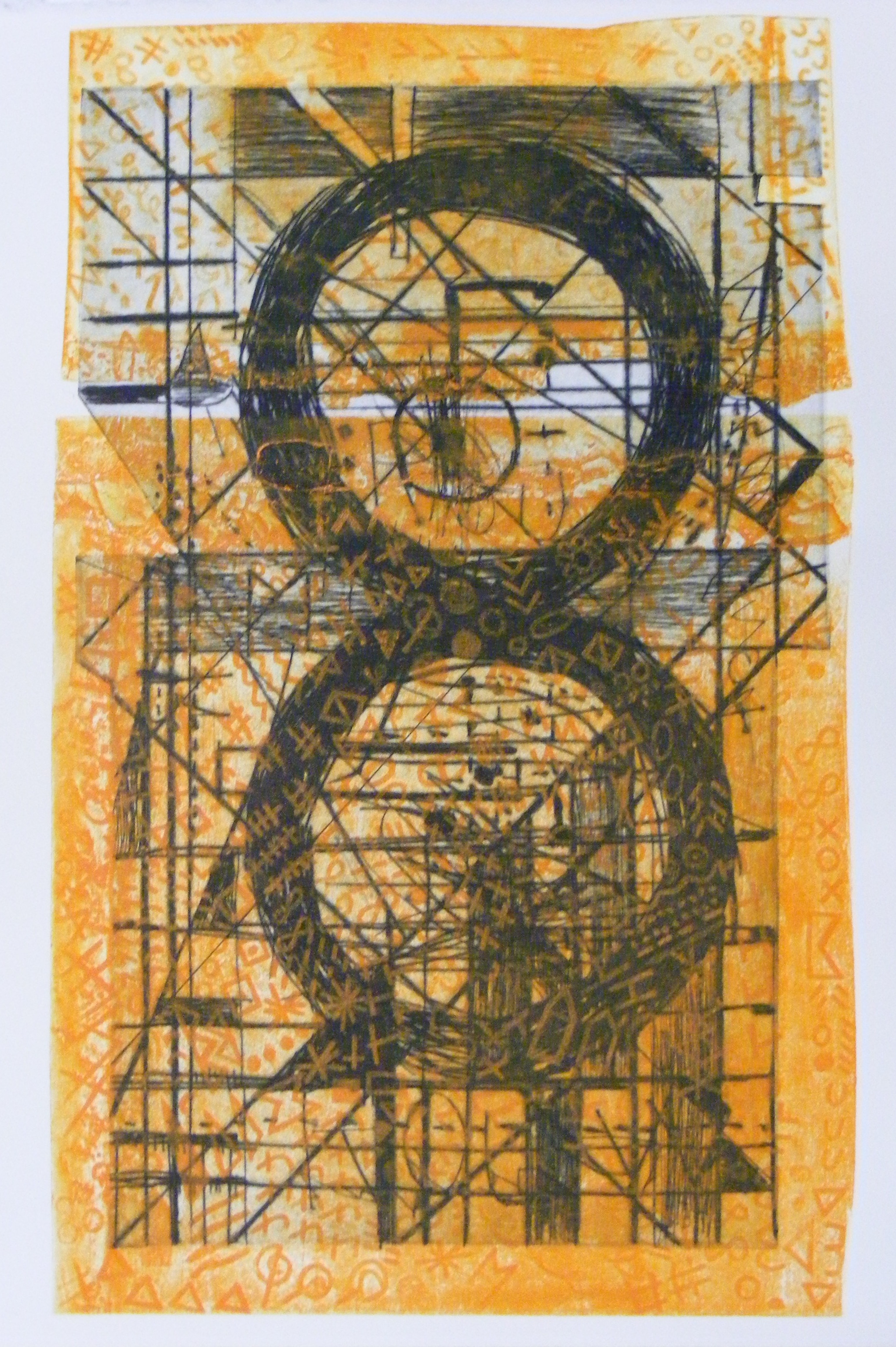 Robuuste prent ontstaan uit afvalzink. Opvallend is de achtvorm, de kleur en het speelse ritme.