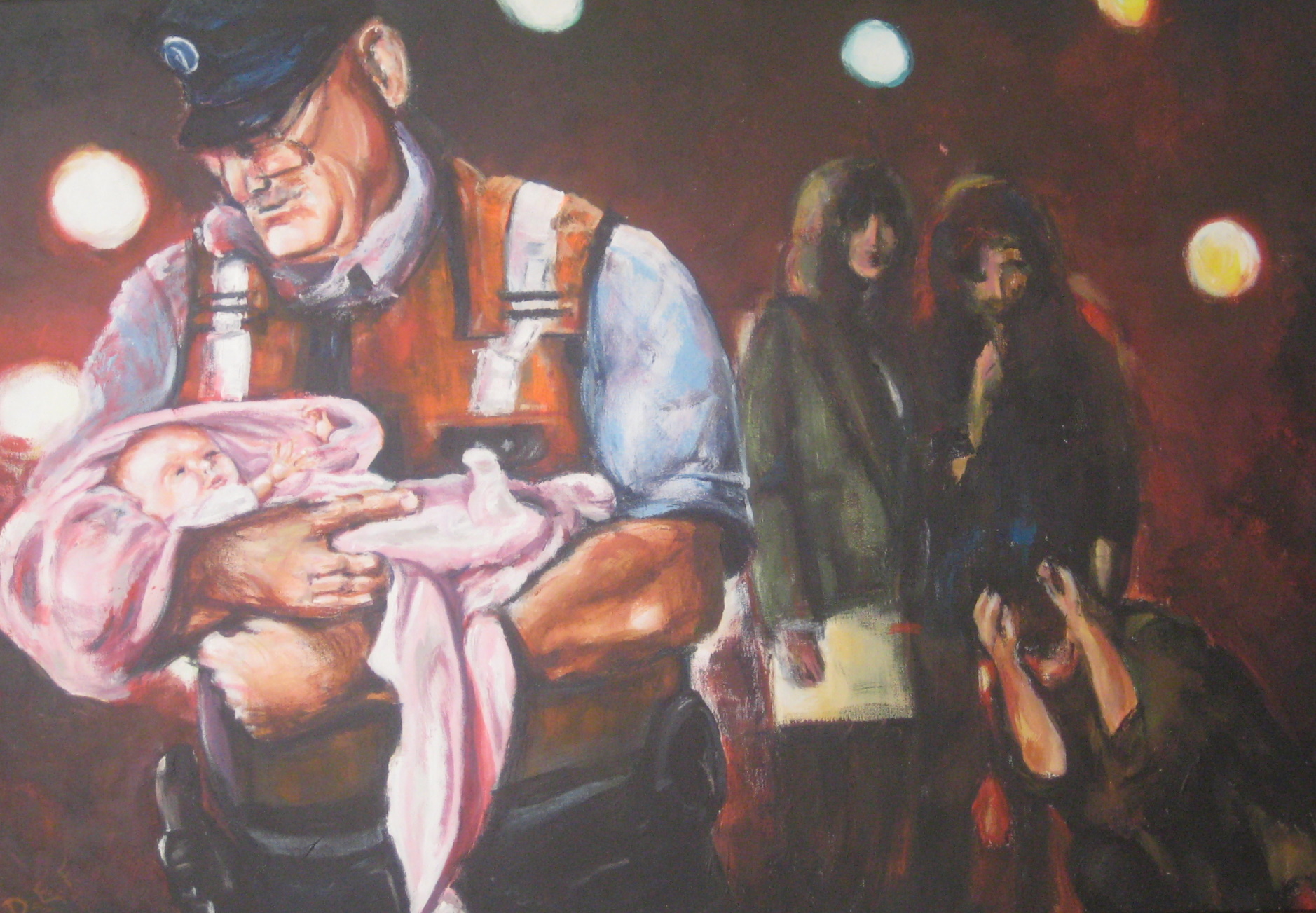 Politie Emotie Blauw Politieagent Uniform Baby Kind Wanhoop Ongeval Ongeluk Vrouwen Ramp Schilderij Acryl