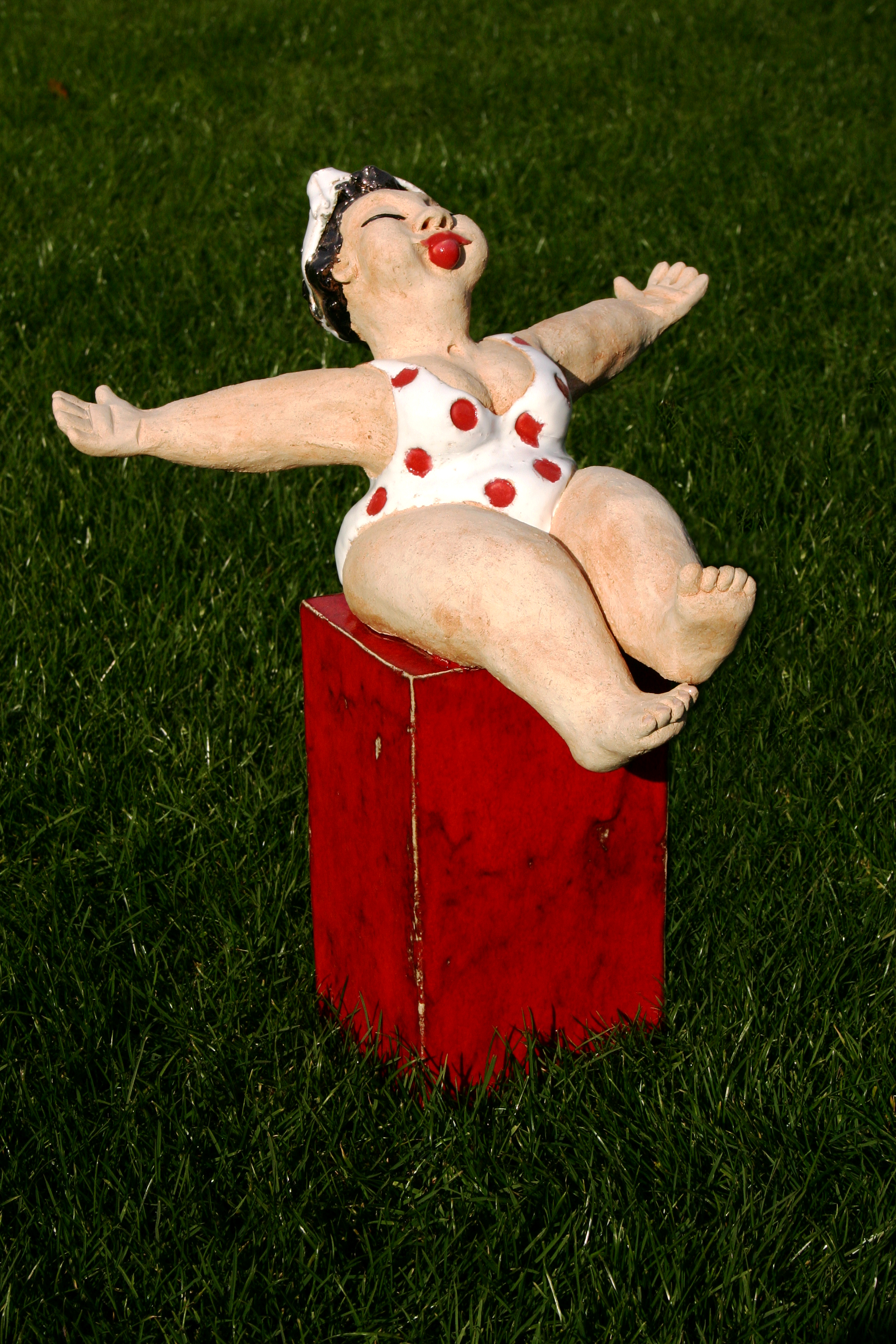 Vrouw in gestippeld badpak op vaste sokkel.