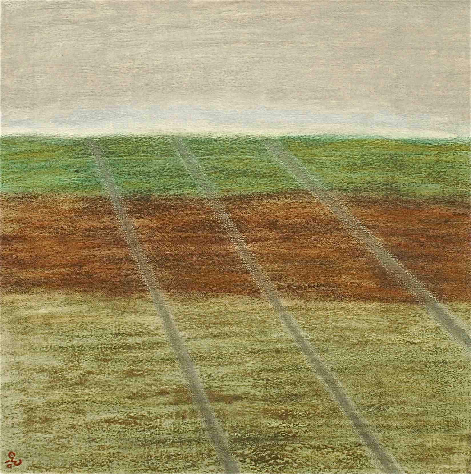 Een van een serie vergezichten bij verschillende jaargetijden en tijden van de dag. Olieverf en -krijt, gewassen.