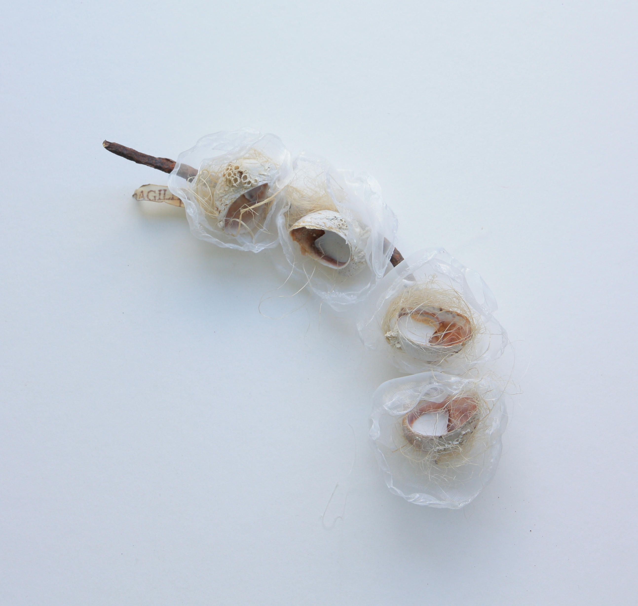 Bij de Duitse Waddeneilanden gevonden: roestige, stalen pennen. De kunstenaar heeft er transparante materialen en schelpen op bevestigd. Het resultaat is een fragiele boog met een sterk contrast tussen het ruwe staal en de tere schelpen.