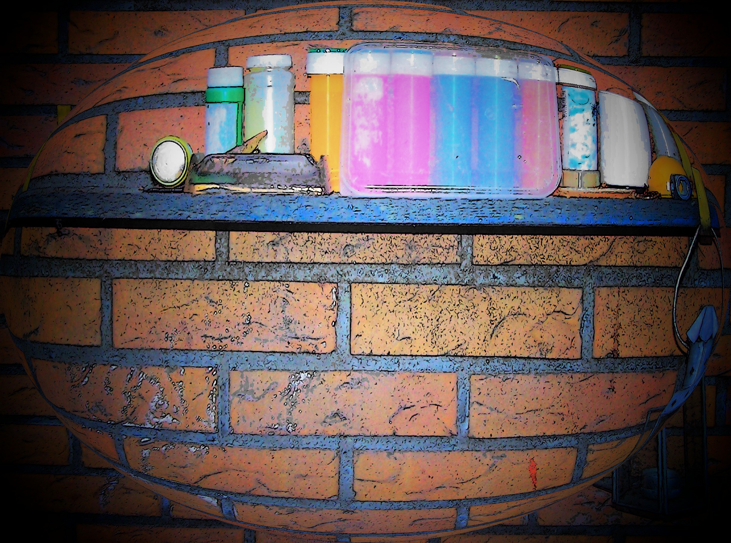 Op een oud plankje staan zeepbelletjesflesjes al jaren en jaren de kleuren vergaan niet alleen het plankje