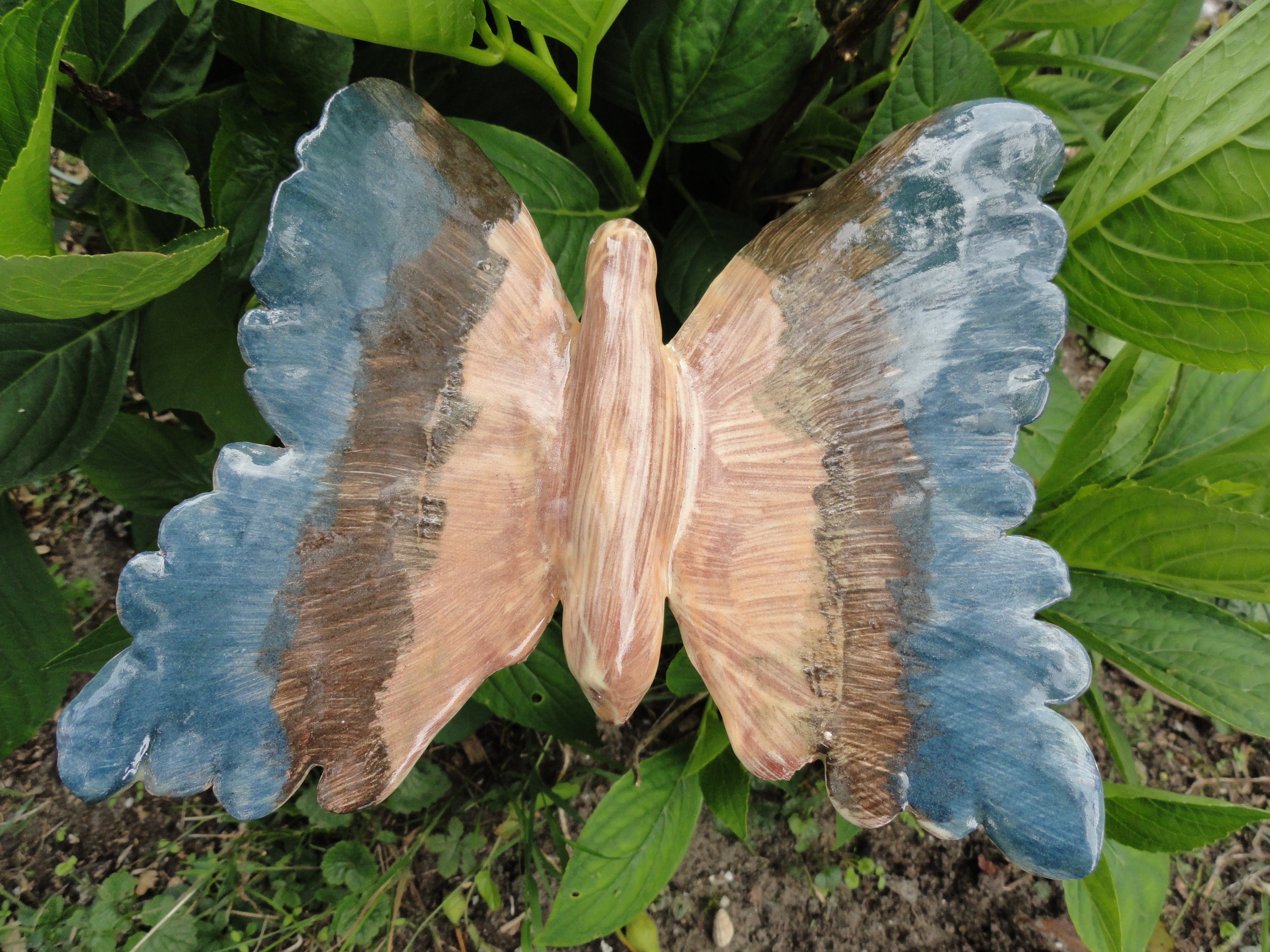 vlinder met grote vleugels, gedecoreerd met verschillende engobes( blauw, groen bruin en paars) en geglazuurd met transparante aardewerkglazuu