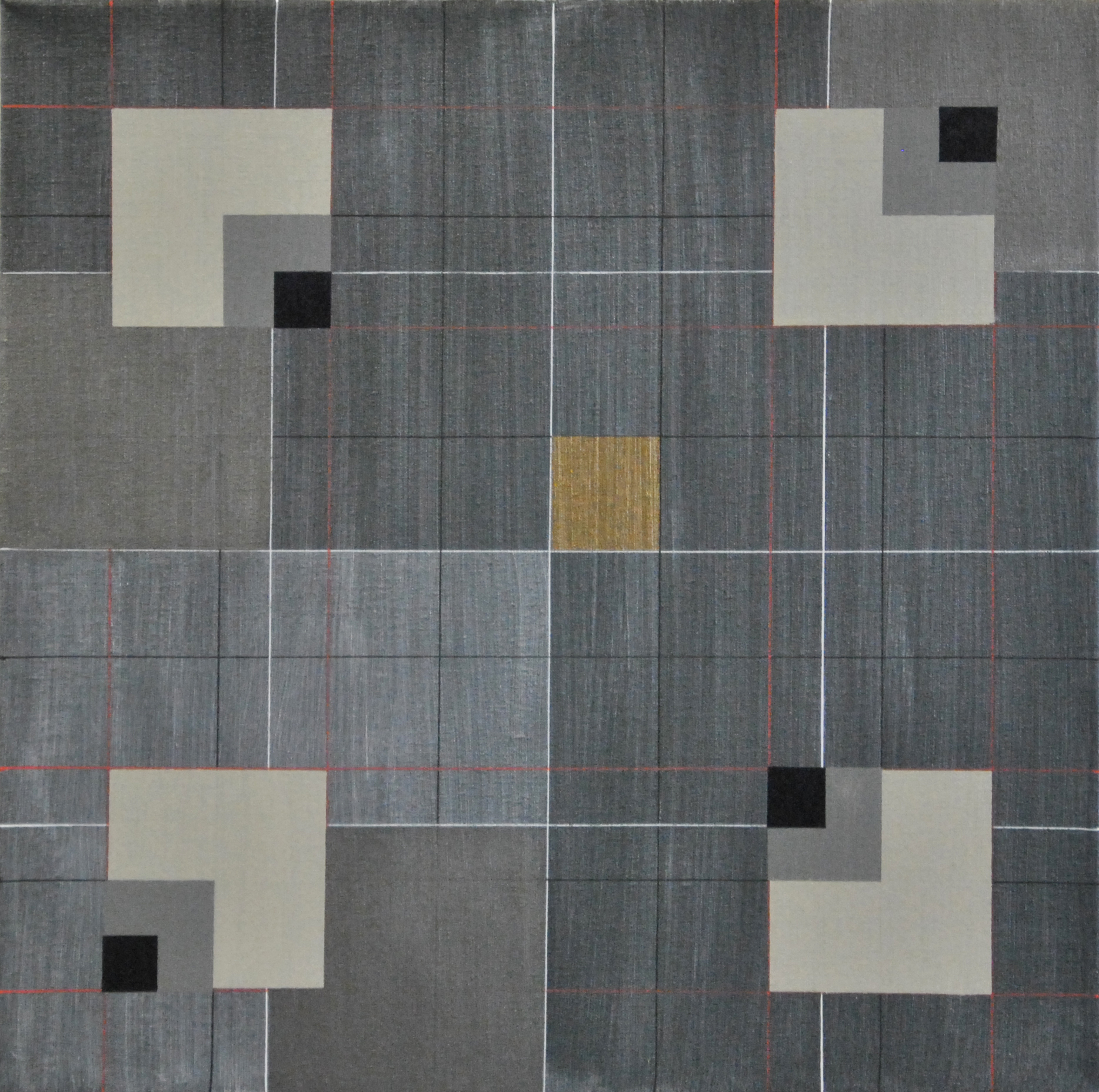 Thema: Chaos (Geometrische Chaos) Mijn kunst is beïnvloedt door de moderne wiskundige en wetenschappelijke benadering van het begrip complexe orde van de natuur. Met name heb ik me verdiept in de Chaos theorie en de fractal geometrie. Ik ben geen wiskundige, en ik gebruik geen wiskundige formules. De ideeën van de Chaos theorie en fractal geometrie leiden tot de ontwikkeling van de composities in mijn werk. Ik gebruik driehoeken,vierkanten en cirkels in mijn schilderijen, maar in mijn huidige serie, geoChao richt ik me alleen op de vierkanten en de verhoudingen tussen de vierkanten. Ik ontwikkel mijn composities door kleine vierkantjes op grote te zetten of grote op kleine te zetten. Het gaat om de onderlinge verhoudingen tussen de vierkanten. Ik laat de methode die ik kies de compositi