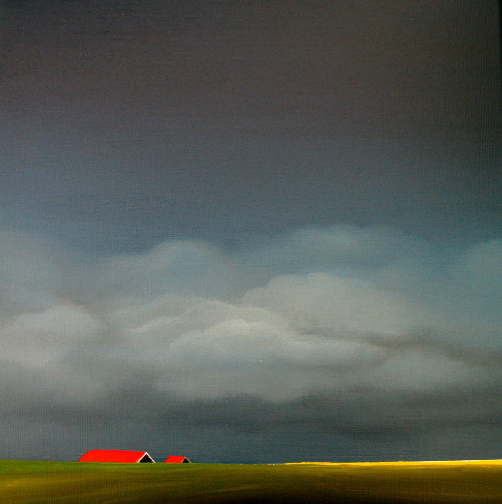 verkocht (Frankrijk) The light at the skyline is accenting the colours of the red roofs and the golden rapeseed fields in a polder in Zeeland. (there where I live)