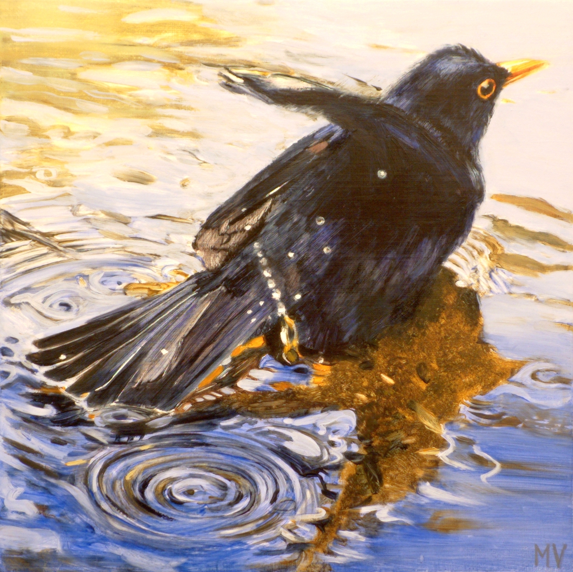 Zwart Blauw Vogel Blue Water Dier Realistisch Olieverf Oilpaint Black Bird Merel Blackbird Anima L Realisctic