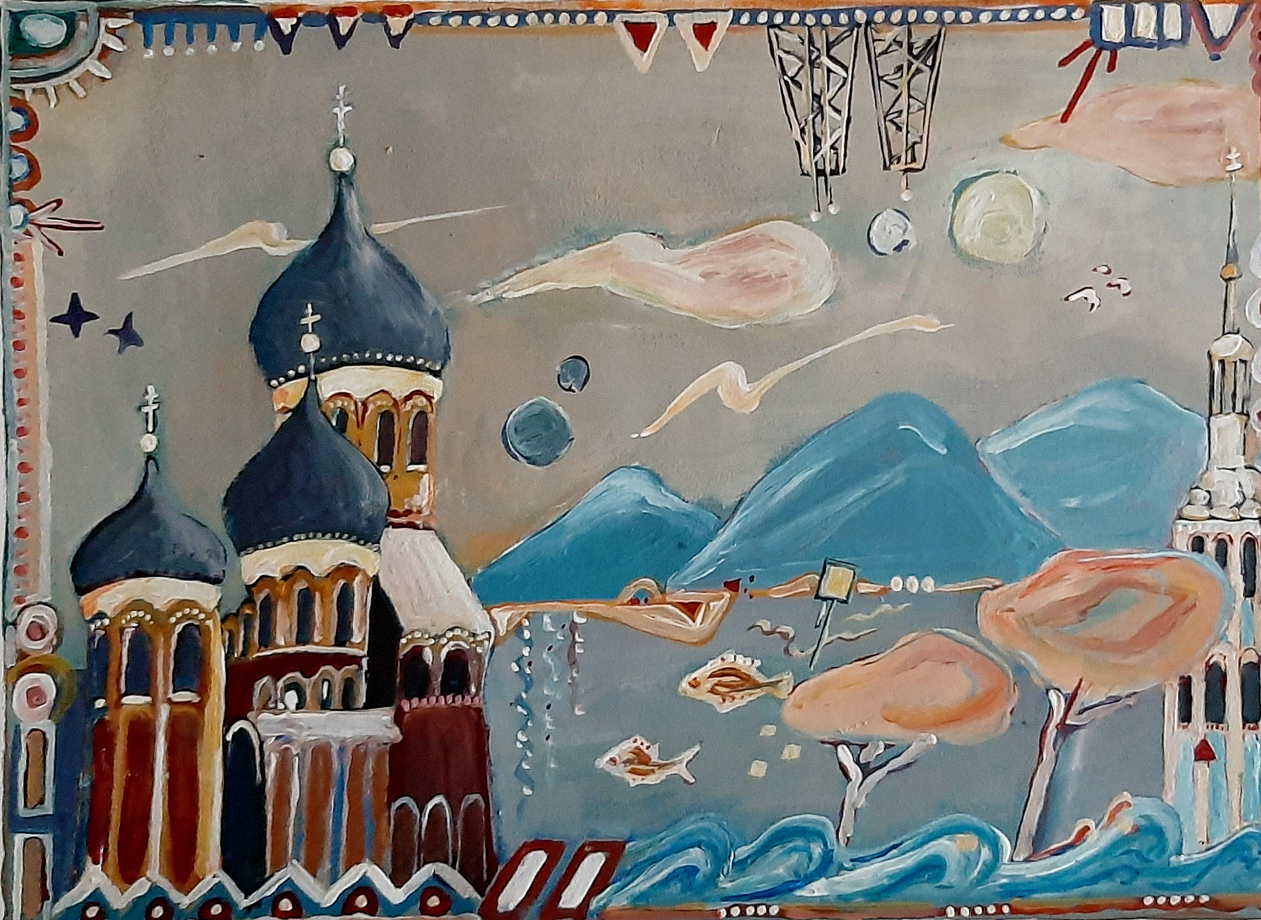 "De Zwarte Zee" van Konstantin Paustovskij, oorspronkelijk gepubliceerd in 1935, speelt zich af op de Krim. Het boek is een mengeling van romantische lyriek en nauwkeurige beschrijvingen vol specialistische kennis over de zee, haar flora en fauna, de winden, het reliëf van de kust, de kustplaatsen en hun geschiedenis. Als Paustovskij op poëtische wijze de kleur van het zeewater beschrijft, geeft hij er meteen de chemische formule bij alsook de uitleg waarom de zee, als gevolg van bepaalde zouten, een groenachtige kleur aanneemt. Het is de sfeer van dit fantastische boek die ik in deze gouache heb vorm willen geven. Paustovkij: hij zorgt ervoor dat je nooit bent uitgelezen, en dat je nooit raakt uiotgeschilderd.