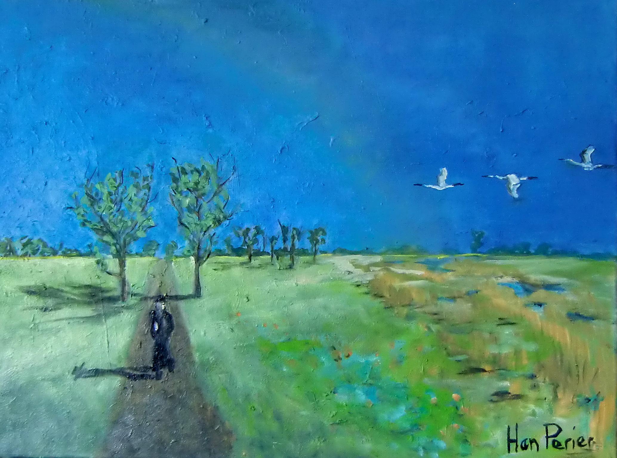 Kunstschilder lopend op de oneindige weg van het ex- en imploderen, waarin de kern, de onbegrensde zuiverheid, als eeuwig wordt ervaren. Dit weergegeven op het linnen van realistisch tot abstract