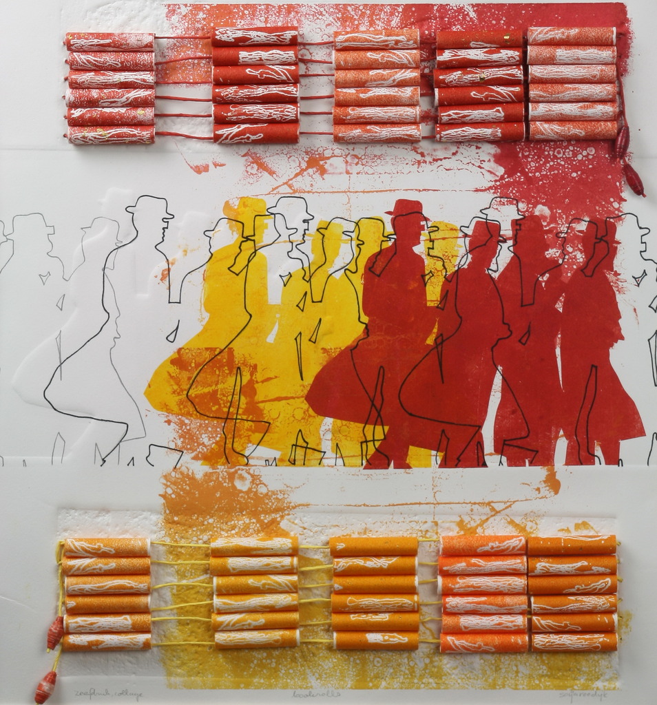 Toen ik deze foto van een groep joden zag kwam ik op het idee van de boekrollen met op de achtergrond de stenen muren hier boven en onder in relief aangebracht. De boekrollen zijn kleine etsjes die na het afdrukken opgerold zijn.