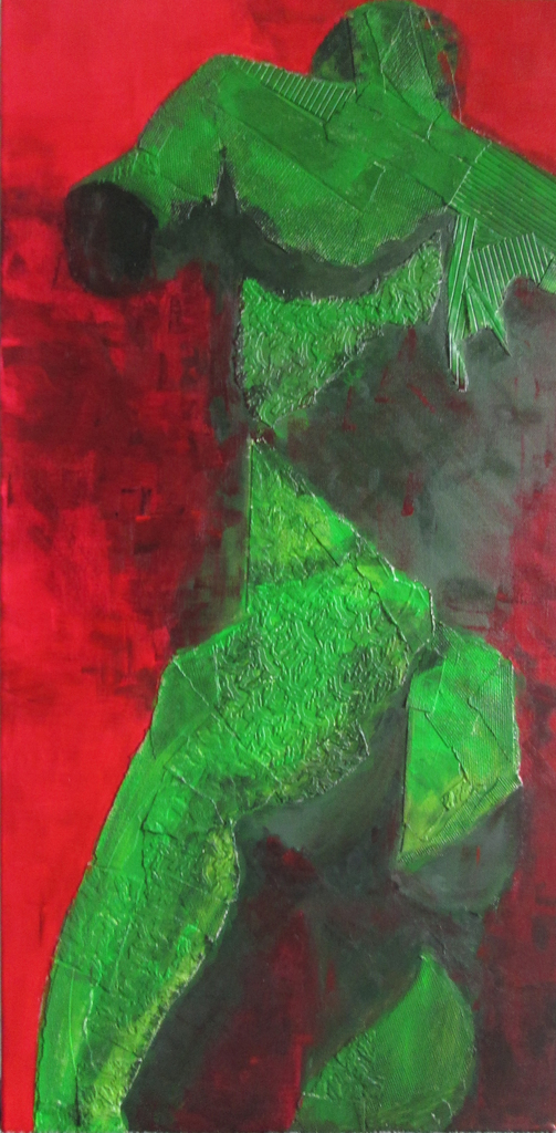 Beeld in rood en groen, gebruik van papier op doek.
