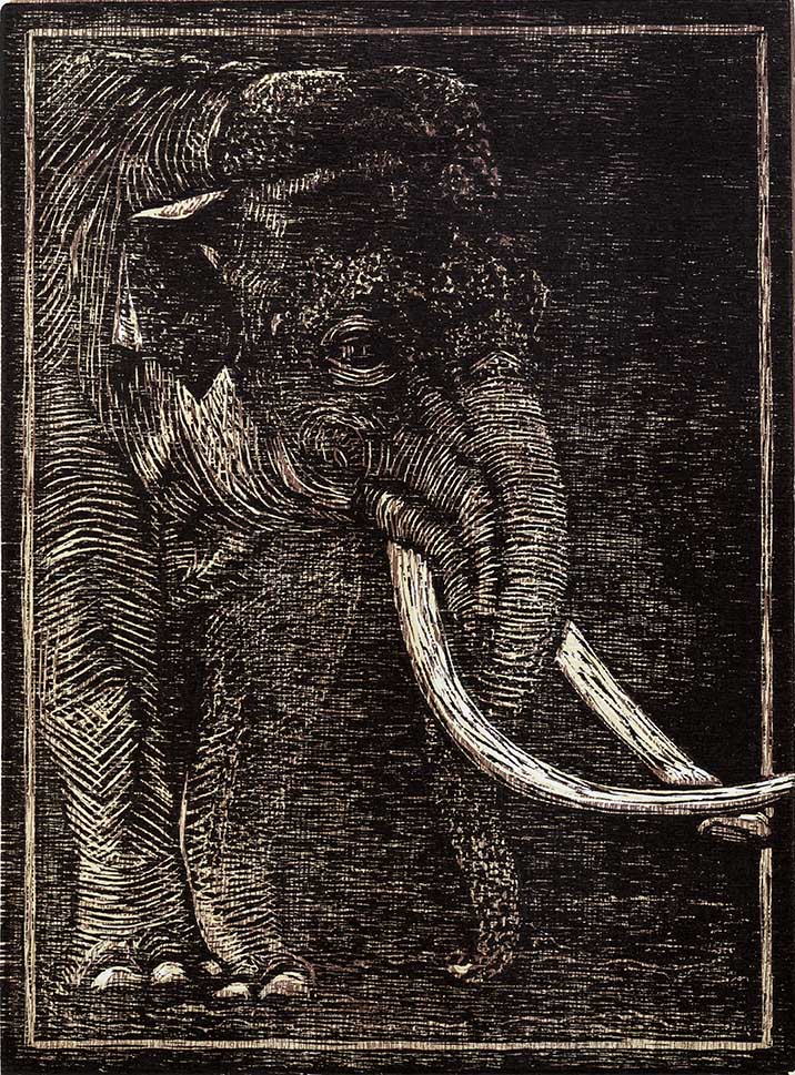 Olifant. Houtsnede, meerkleurendruk van drie blokken.