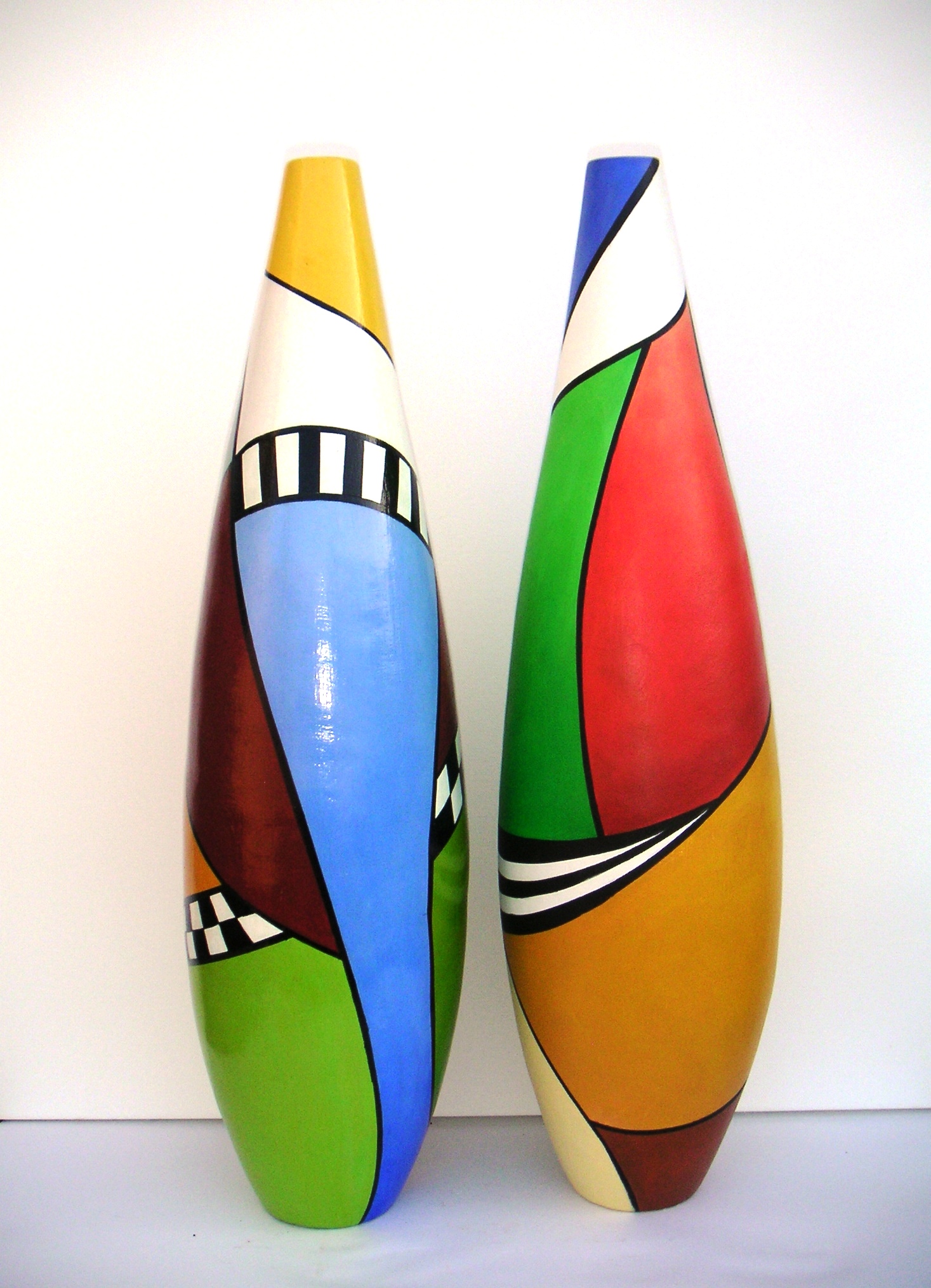 Deze vazen zijn van bamboe. De buitenkant heb ik bewerkt met milieuvriendelijk kunsthars “Acrylic-one” waardoor de vazen een harde toplaag hebben en nagenoeg onbreekbaar zijn. Door het schuren van de vele lagen ontstaat er een mooi glad oppervlak. De vazen heb ik beschilderd met acrylverf en afgewerkt met een hoogglansvernis. Elke vaas is een kunstobject en niet bedoeld als bloemenvaas.