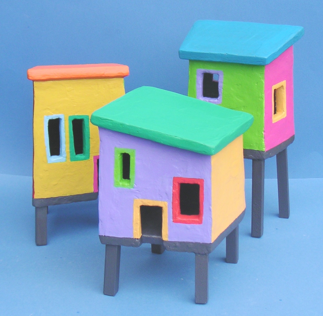 De huisjes zijn gemaakt van plaatmateriaal en afgewerkt met plamuur. Daarna beschilderd met acrylverf en als laatste behandeld met een matte vernislaag. De huisjes staan op houten poten. Genoemde maten zijn gemiddeld. De prijs is per drie