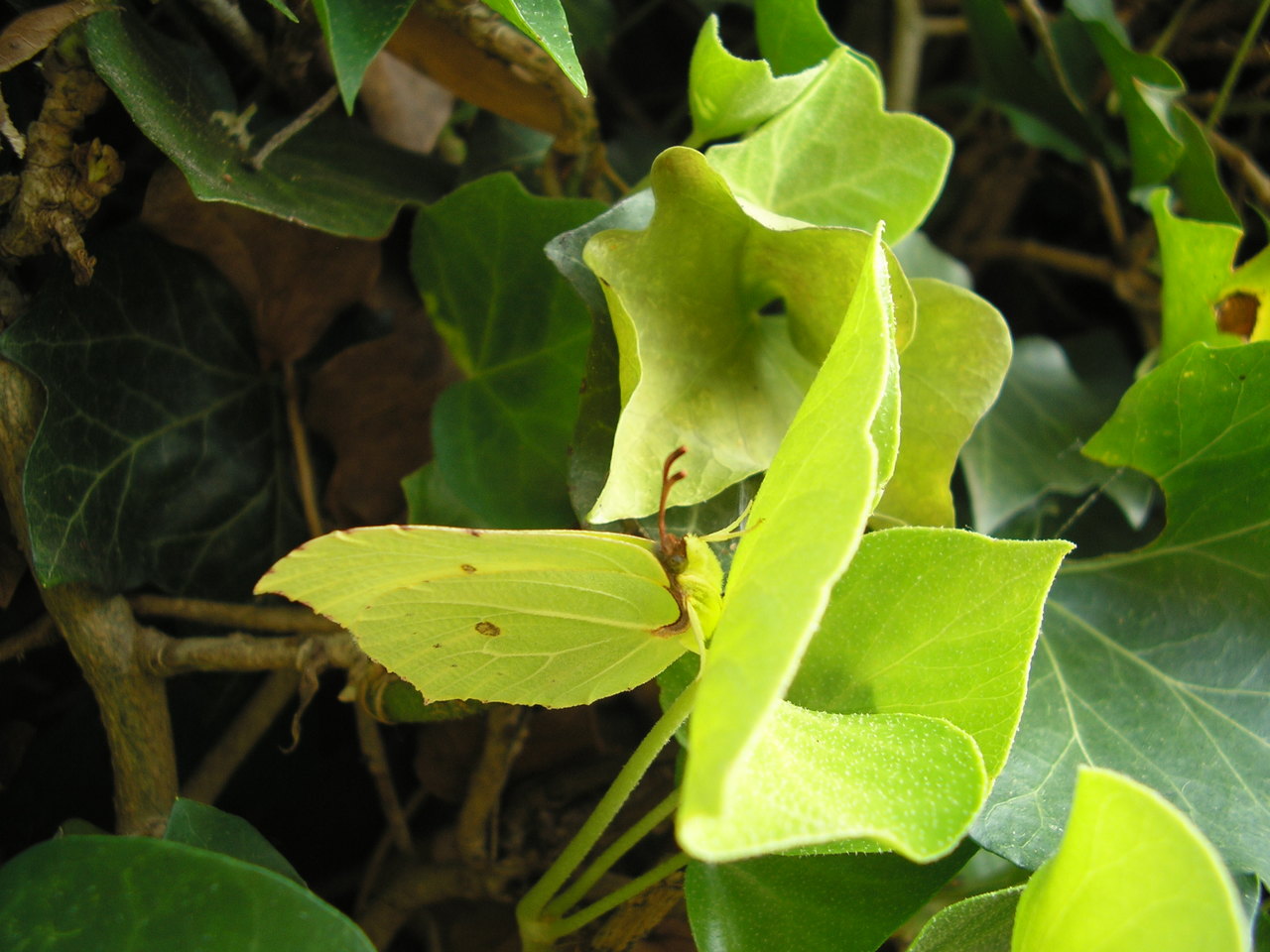 Deze citroenvlinder heeft een prachtige camouflage op dit klimop blad. De prijs is de foto bewerkt op een canvasdoek.