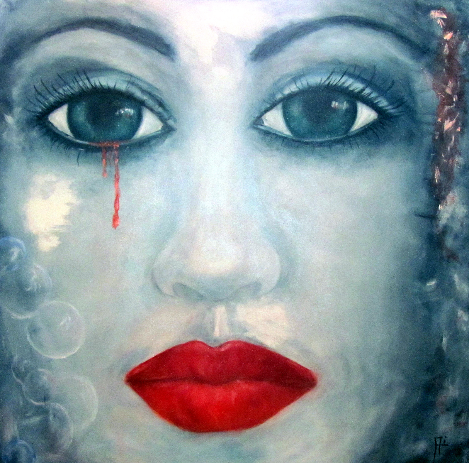 close-up in blauw, mixed media 3-D, zijkanten meegeschilderd