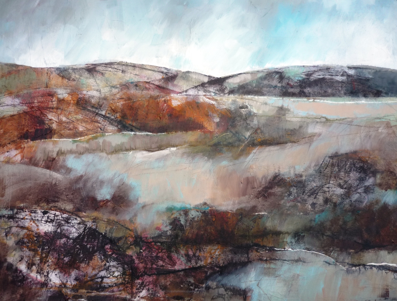 Een gemengde techniek (acryl en monotype ) op doek .De inspiratiebron zijn gebieden in Ierland en Schotland met water ,lage heuvels en eindeloze leegtes.