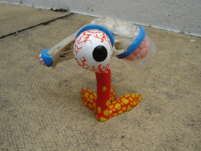 Een verder experiment om de perfecte imperfectie te creeeren. Wederom staan de ogen in een hoek van 90 graden , maar dit keer heb ik een been toegevoegd die verbonden is met het grote ook. De schedel, van een konijn, kan ook bewegen om het verschillende posities te geven. De posities wekken de indruk dat je te maken hebt met een vogel.