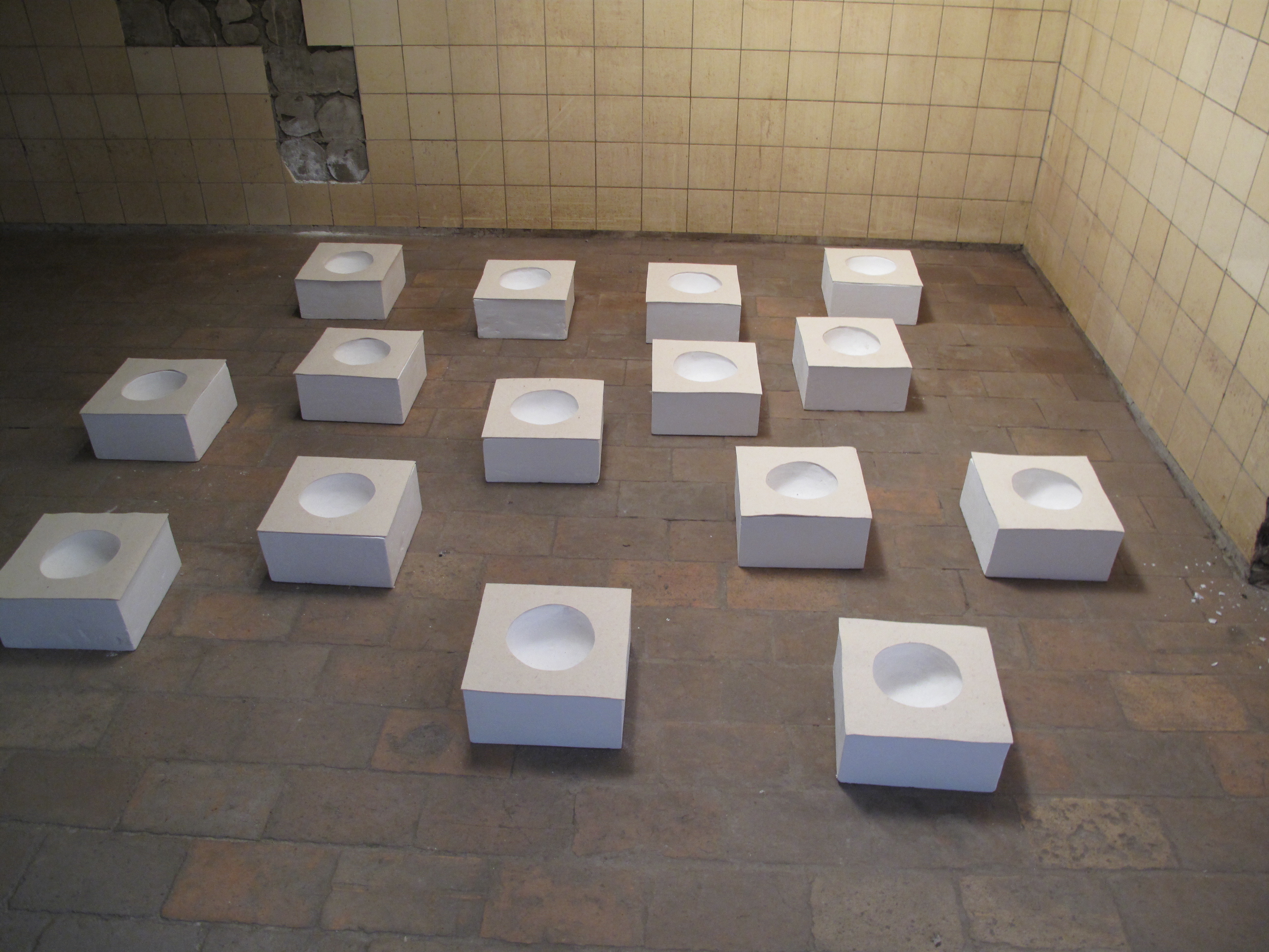 15 vormen van gips met een uitsparing van een halve bolvorm, daarop ligt een vilten vorm
