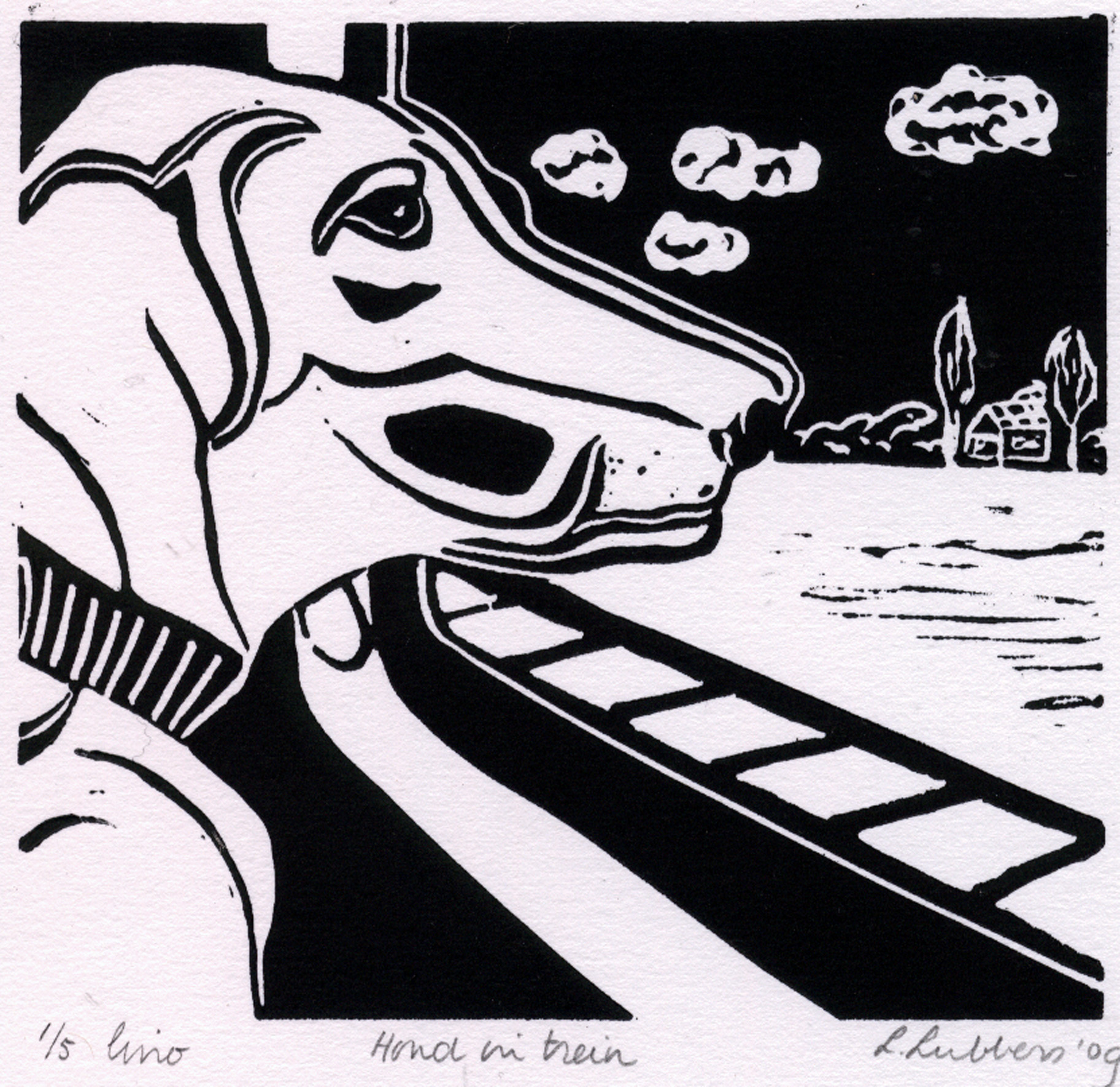 Realistisch Grafiek Hond Black Dog Trein Print Train Linosnede Linocut Zwart-wit
