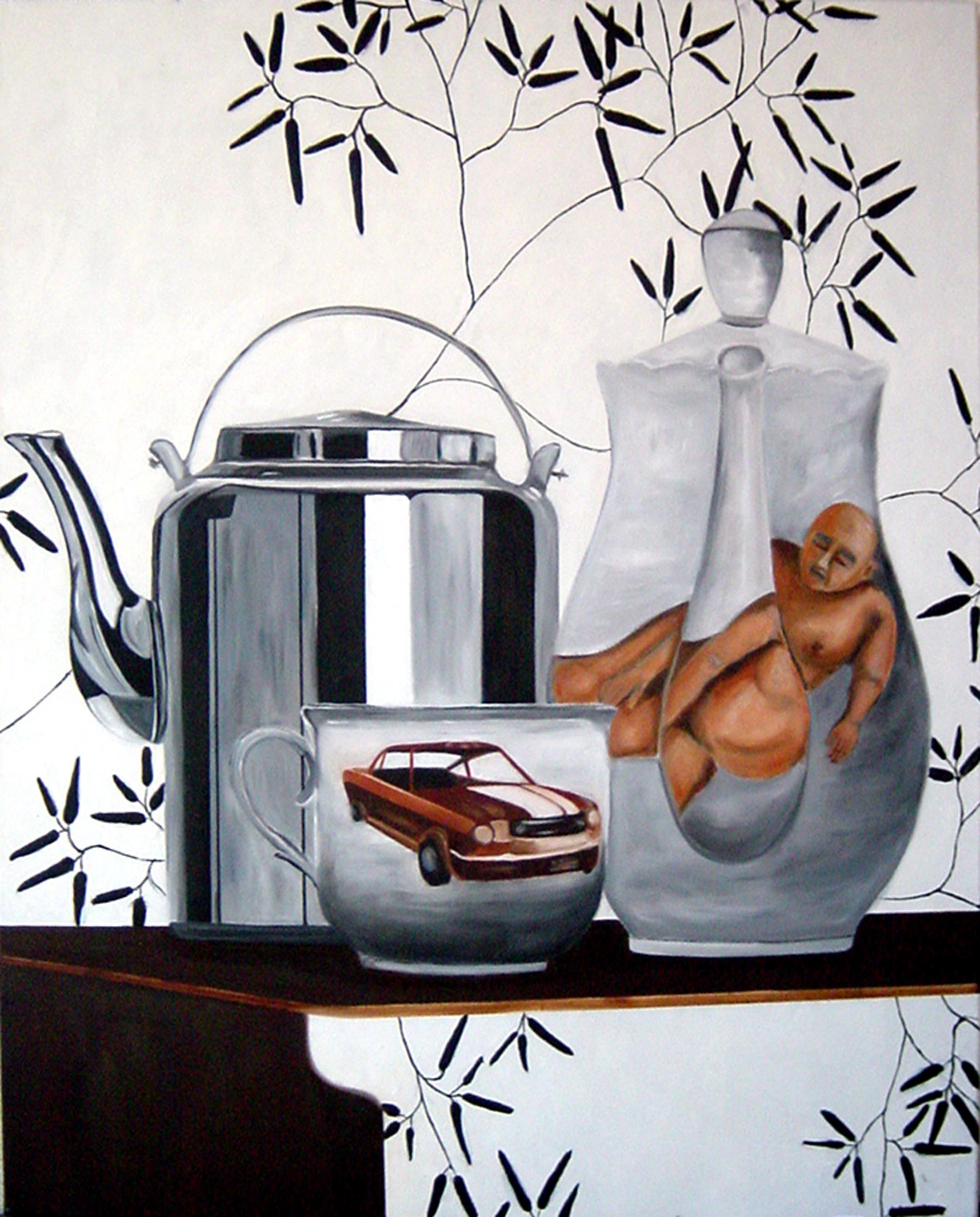 Schilderij Man Naakt Nude Realistisch Painting Stilleven Koffiepot Realistic Stillife Reflecting Coffeepot Cip