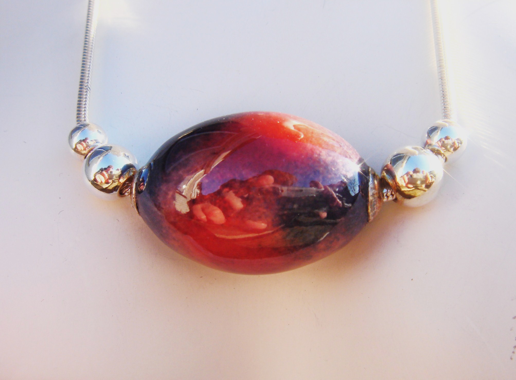 Rode en blauwe emaille op koperen kraal, afgewerkt met zilver en zilveren collier. In meerdere kleuren verkrijgbaar.