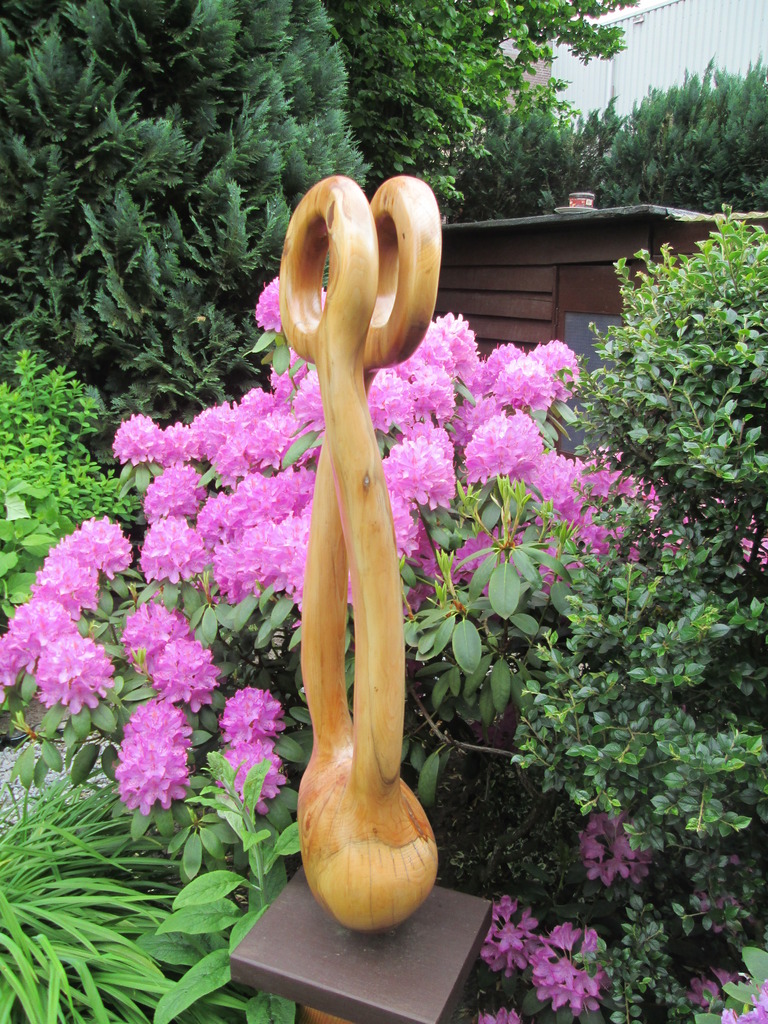 Door totempalen in Canada geinspireerd geraakt ben ik sinds 2002 met hout gaan werken daarvoor beeldhouwde ik met steen In onze Beeldentuin AJ & LW Bier komen de Sculpturen helemaal tot zijn recht