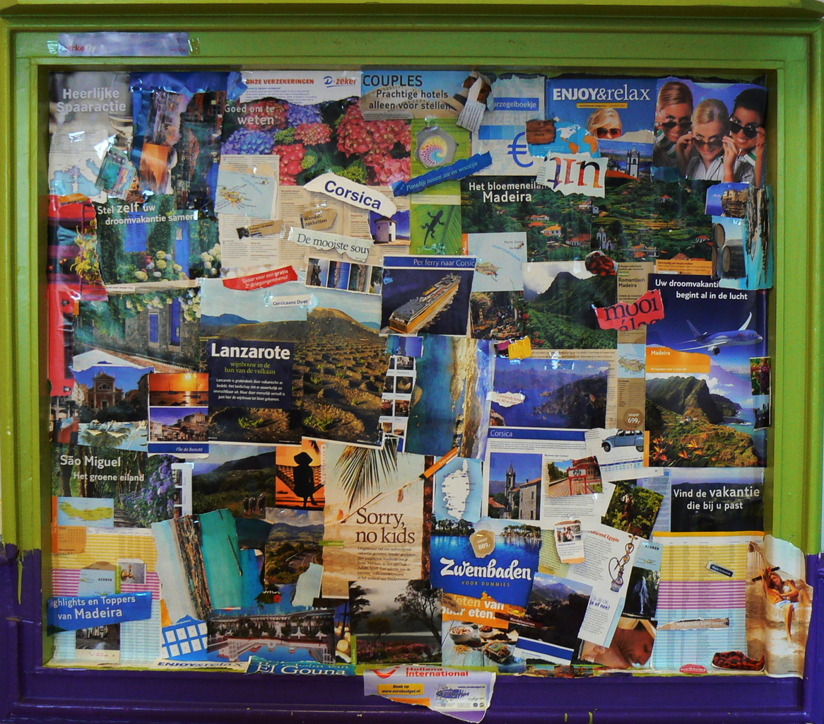 Collage van dromen / want wie wil niet zwerven op Madeira, Corsica / of de Azoren. Van brochures samengesteld door Drager Meurtant en Jeanine Keuchenius in Het DeprARTment te Schagen, tgv hun expositie (auf - sept '14)
