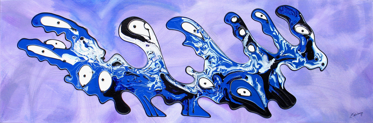 Modern kleurrijk schilderij van kunstenaar Erik Loman. Acryl op linnen, 50x150cm, 2010.