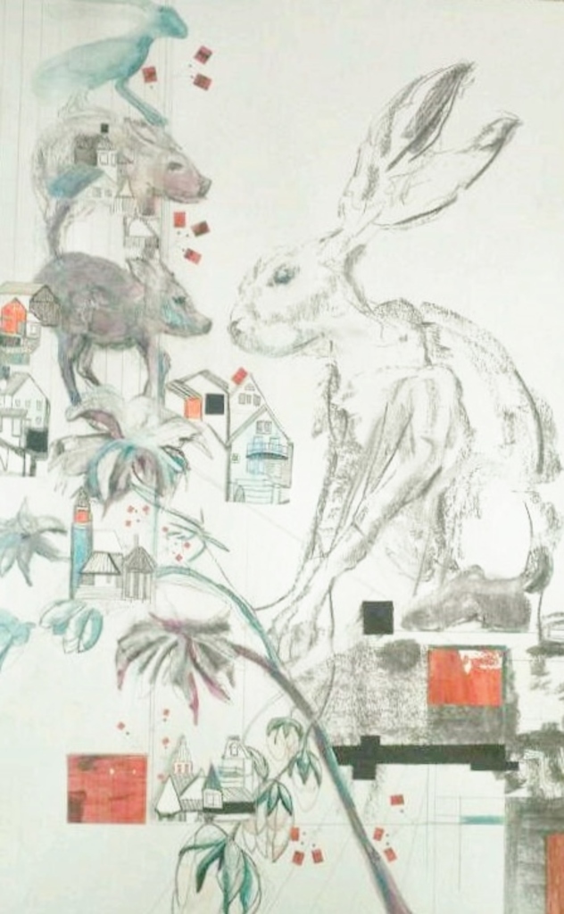Haas kijkt naar de wereld. Haas zoekt de aarde. Mixed media op papier. Houtskool, pentekeningen, acrylverf, potlood. VERKOCHT