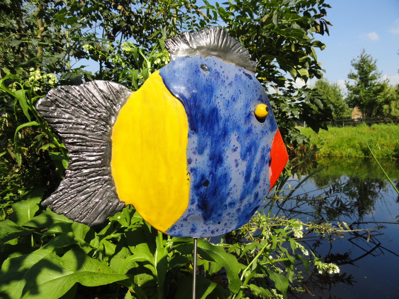 Grote koningsvis geboetseerd uit witte aardewerklei en geglazuurd met vier verschillende glazuren. De vis staat op een ijzeren pin en kan gemakkelijk gestoken worden in een bloemenborder of langs het water/slootkant. Een prachtige aanvulling van elke tuin.