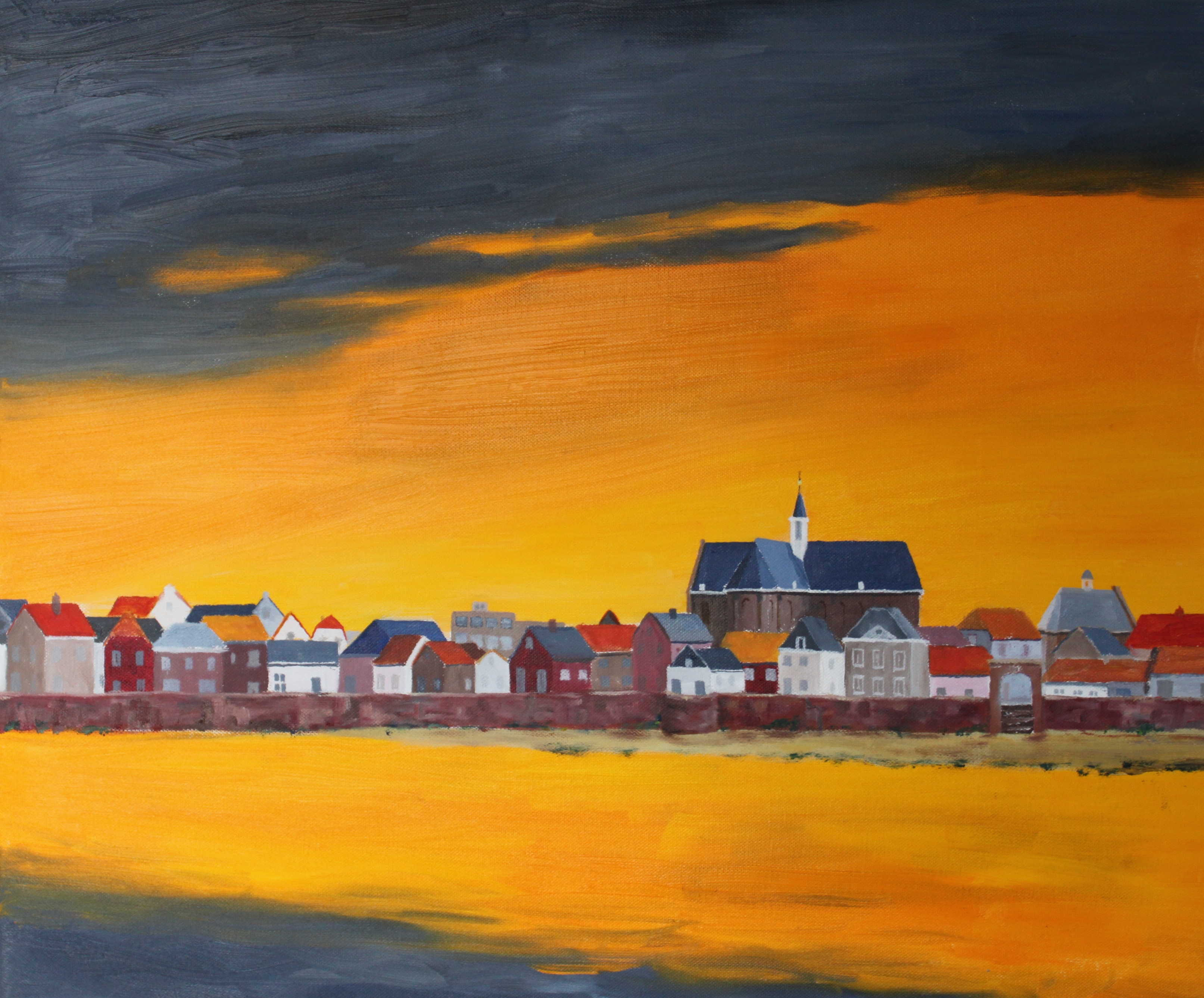Gezicht op Grave over de Maas, bij zonsondergang.