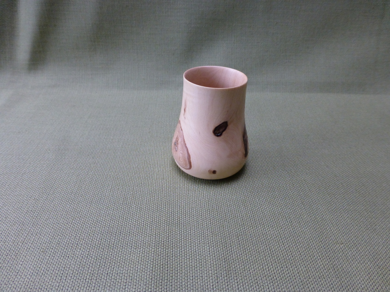 Verkocht. Een vaasje met aan de bovenkant een doorsnee van 3,5 cm en aan de onderkant 4,5. De bovenkant is heel dun gedraaid, aan de onderkant is het dikker, dit komt de stabiliteit ten goede.