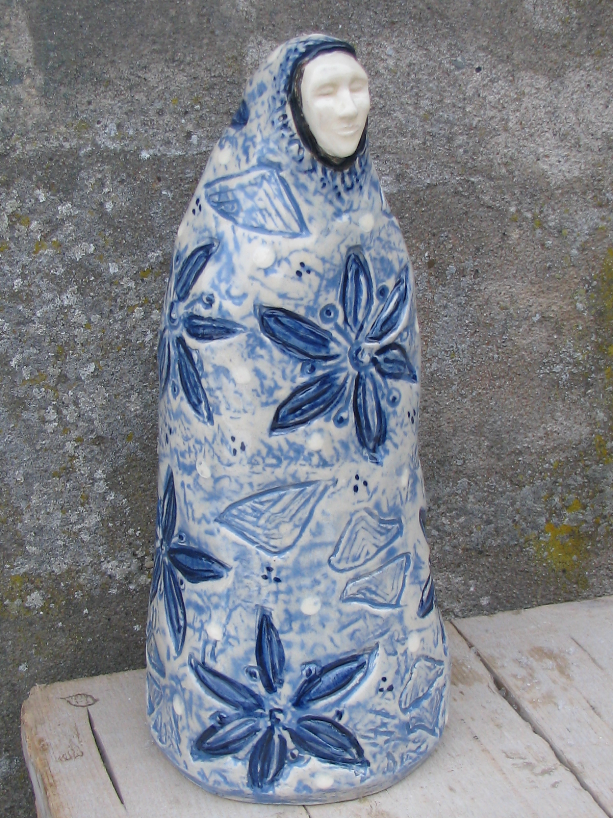 Vrouwfiguur in blauw gewaad met in de klei gestempelde bloem decoratie