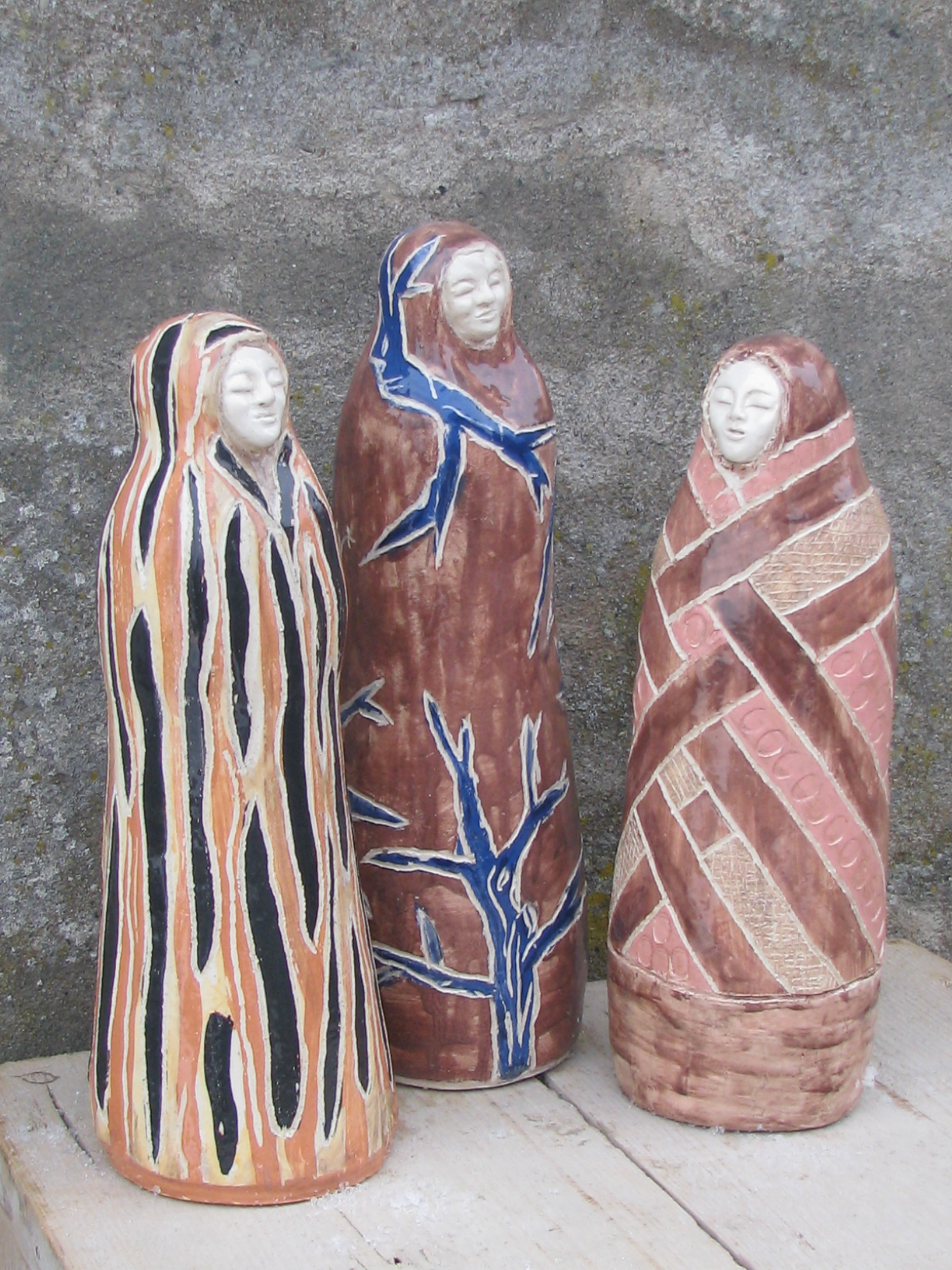 drie Vrouwfiguur in een bruingetint gewaad met als decoratie uitgekerfde lijnenpatroon