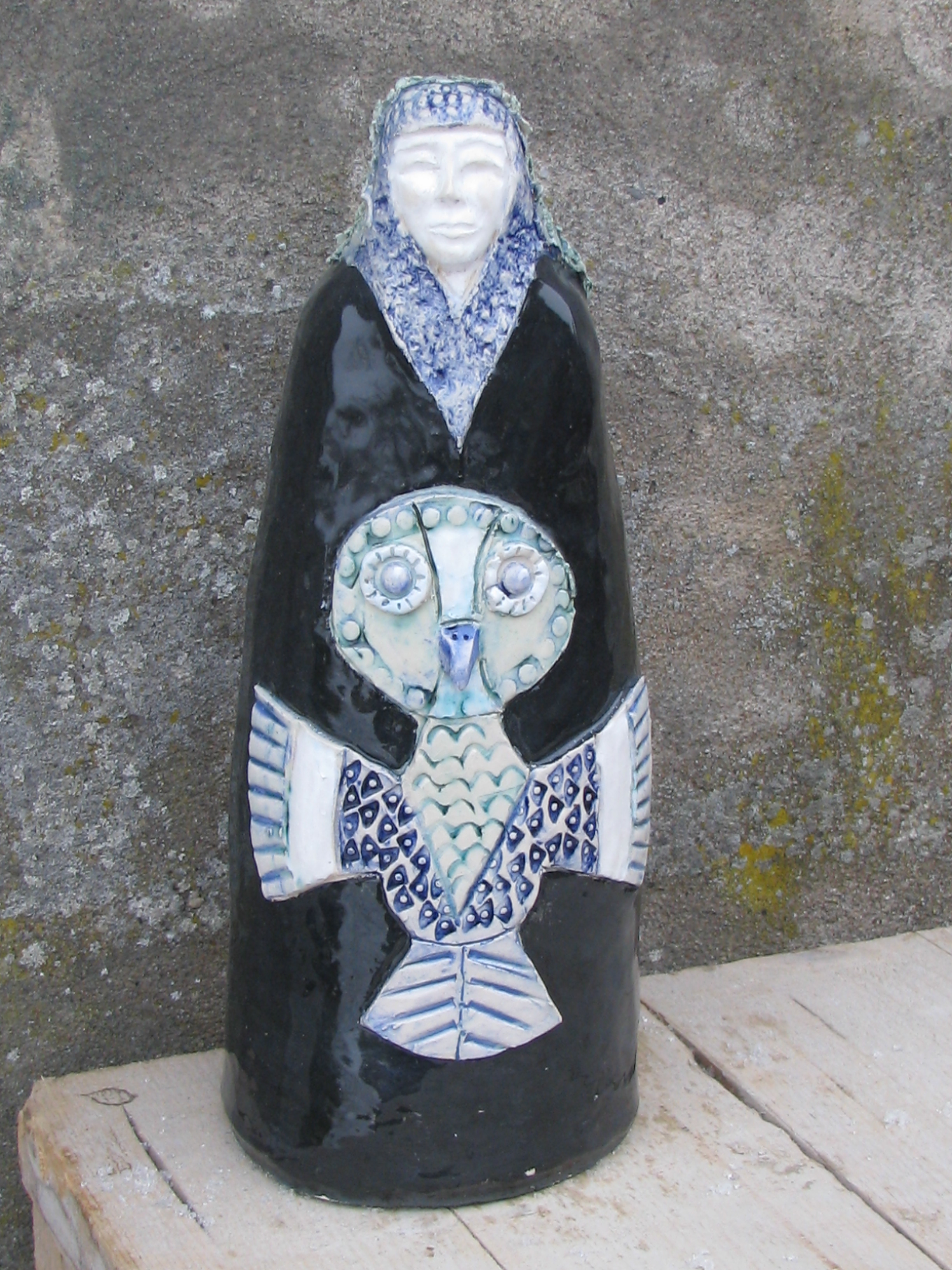 Vrouwfiguur in zwart gewaad met als decoratie een relief uil, achterkant heeft ze geschubd haar.
