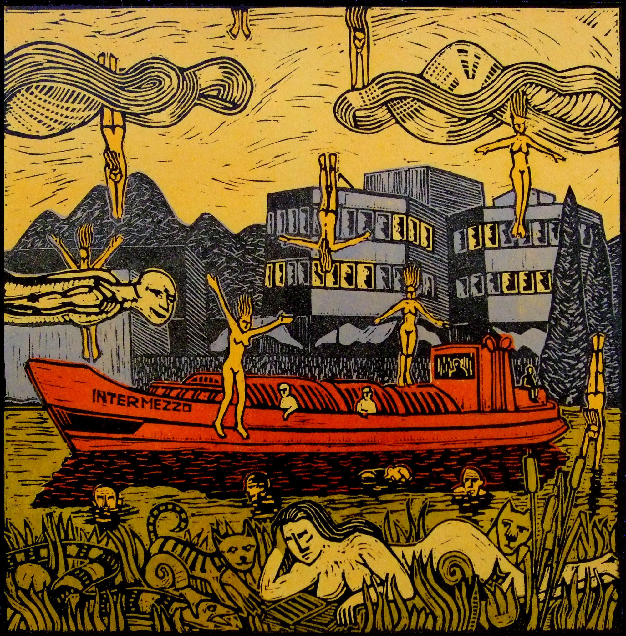 Linosnede: o.a. geïnspireerd op Magrittes "Golconde" en de haven van Hilversum.