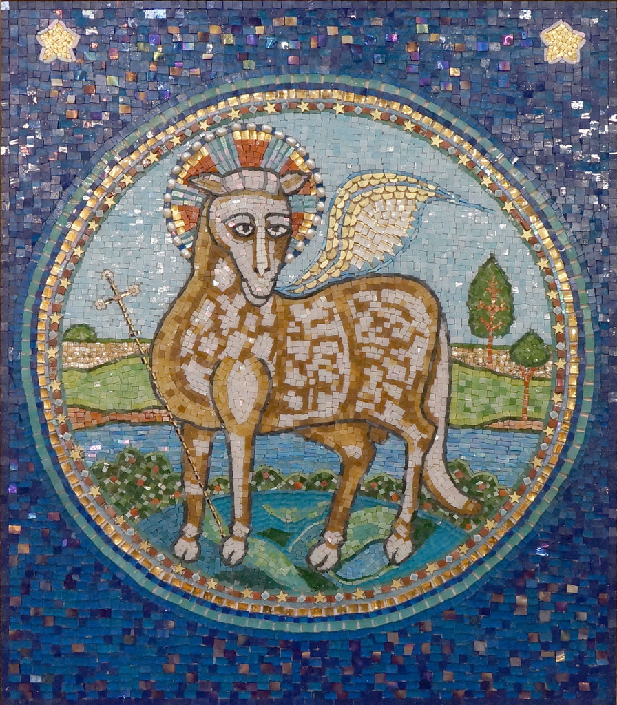 Dit mozaiek is geinspireerd door Byzantijnse religieuze kunst en opgebouwd uit Venetiaans glas en oude porceleinen serviezen.