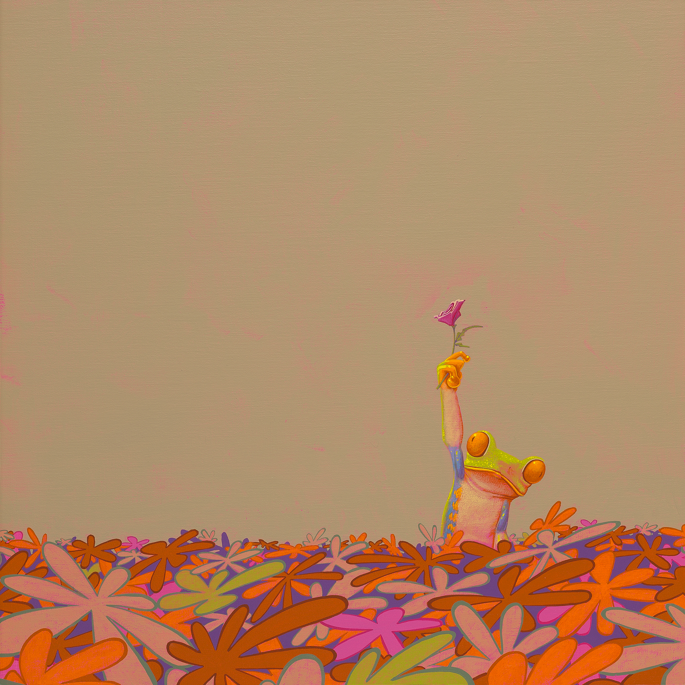 Schilderij van een boomkikker die tussen allemaal bloemen een roos heeft gevonden.