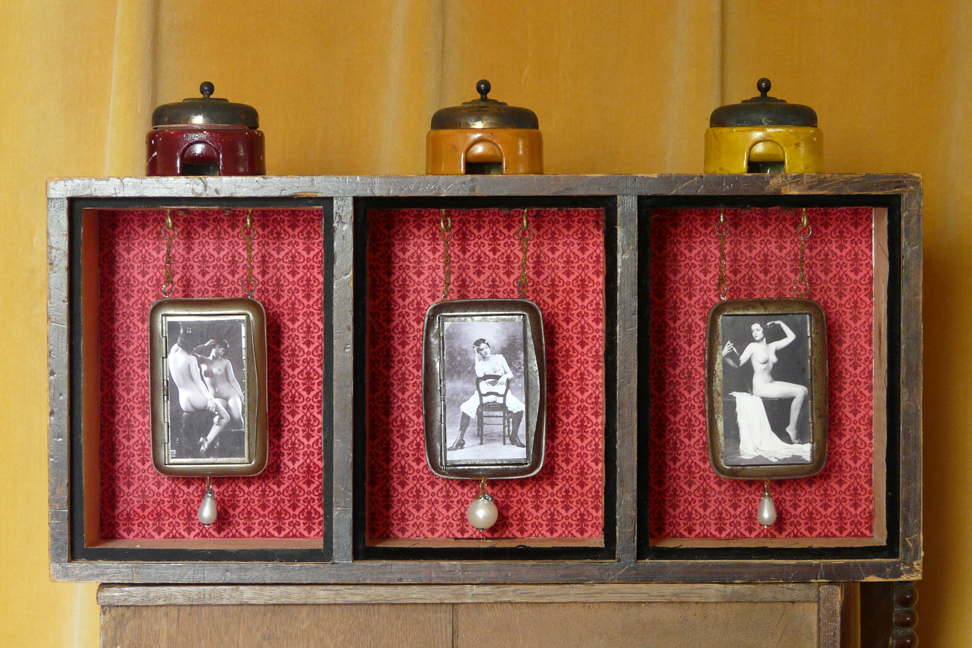 oud kistje uit donkere kamer, sigarettendoosjes, foto's afgedekt met glas