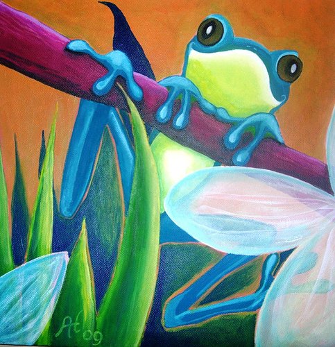 Wit Oranje Blauw Acryl Paars Groen Kleurig Kikker Vrolijk Sprookje Fantasie Kinderschilderij Gifkikker Babyschilderij
