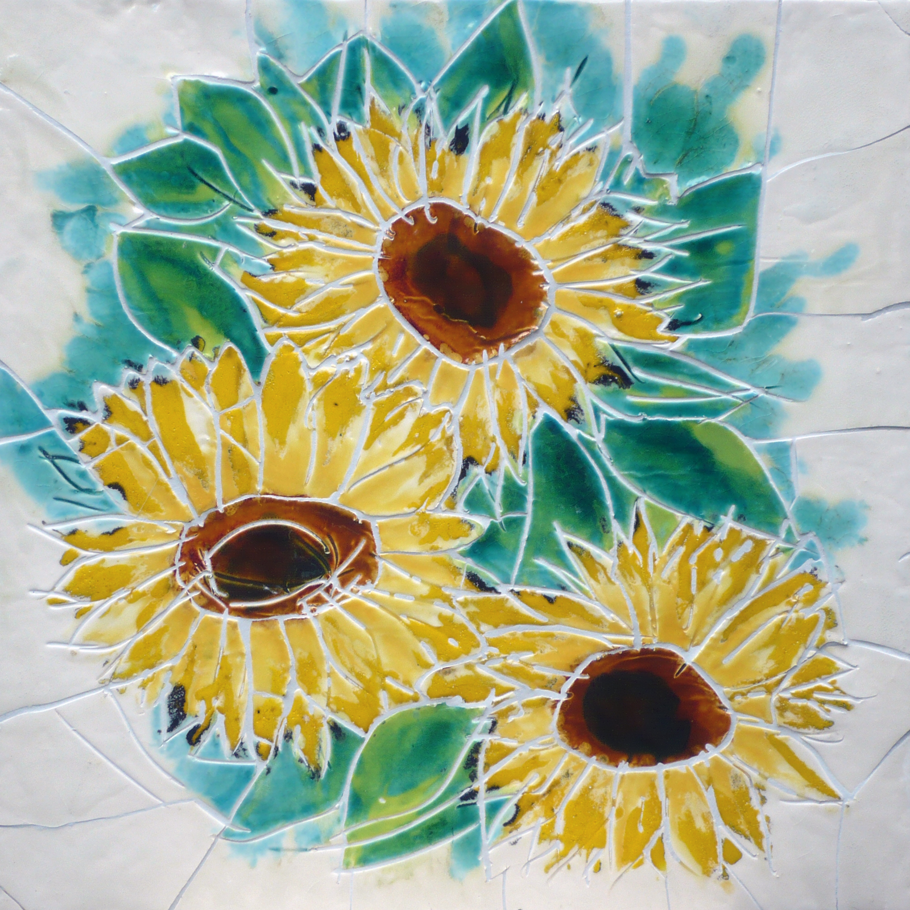 Een boeket van drie zonnebloemen in eenvoudige glazuurtinten; glanzend transparant achtergrond, licht grijs gevoegd.
