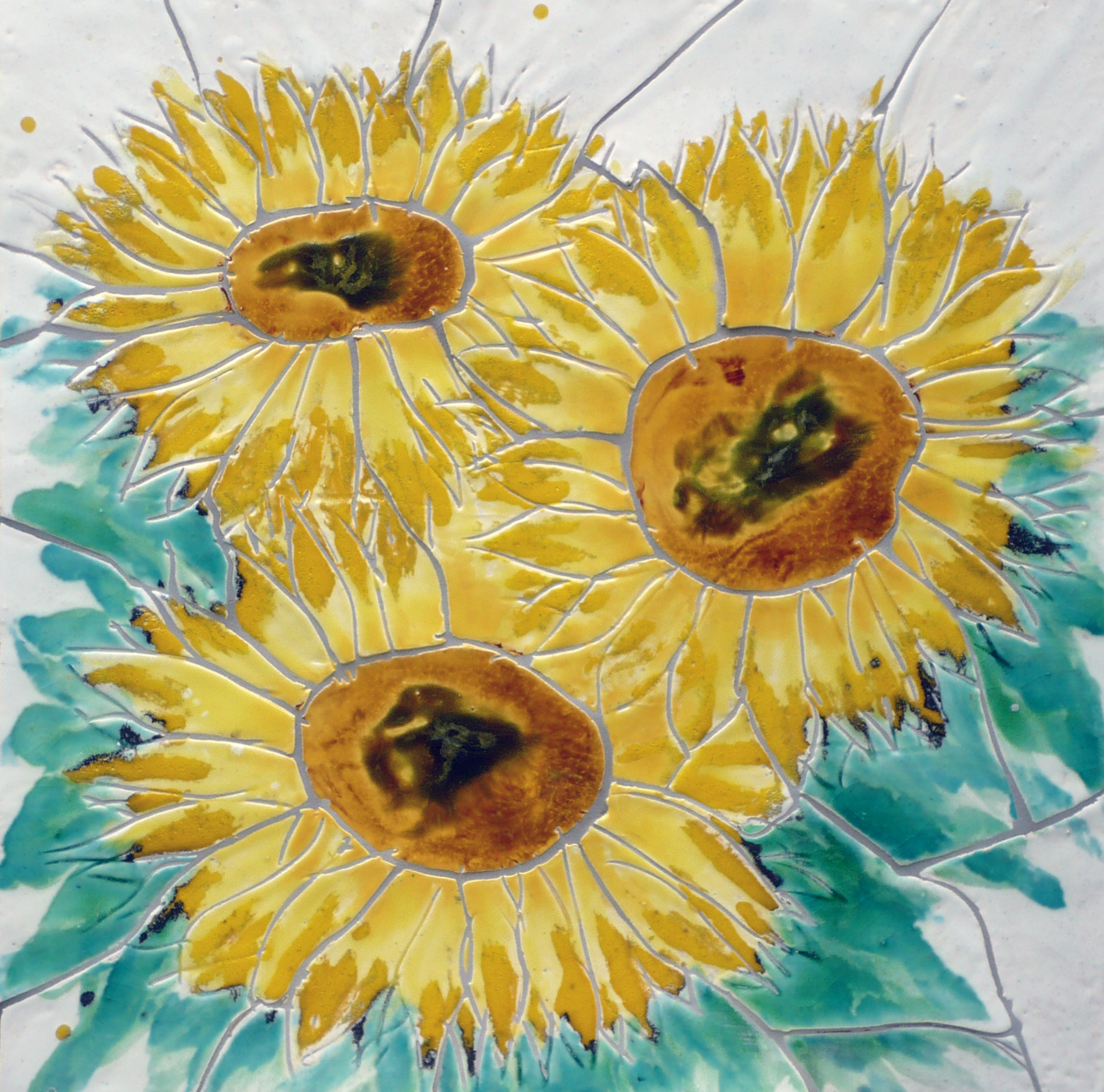 een boeket van drie zonnebloemen in eenvousige glazuurtinten, mat transparante achtergrond en donkergrijs gevoegd