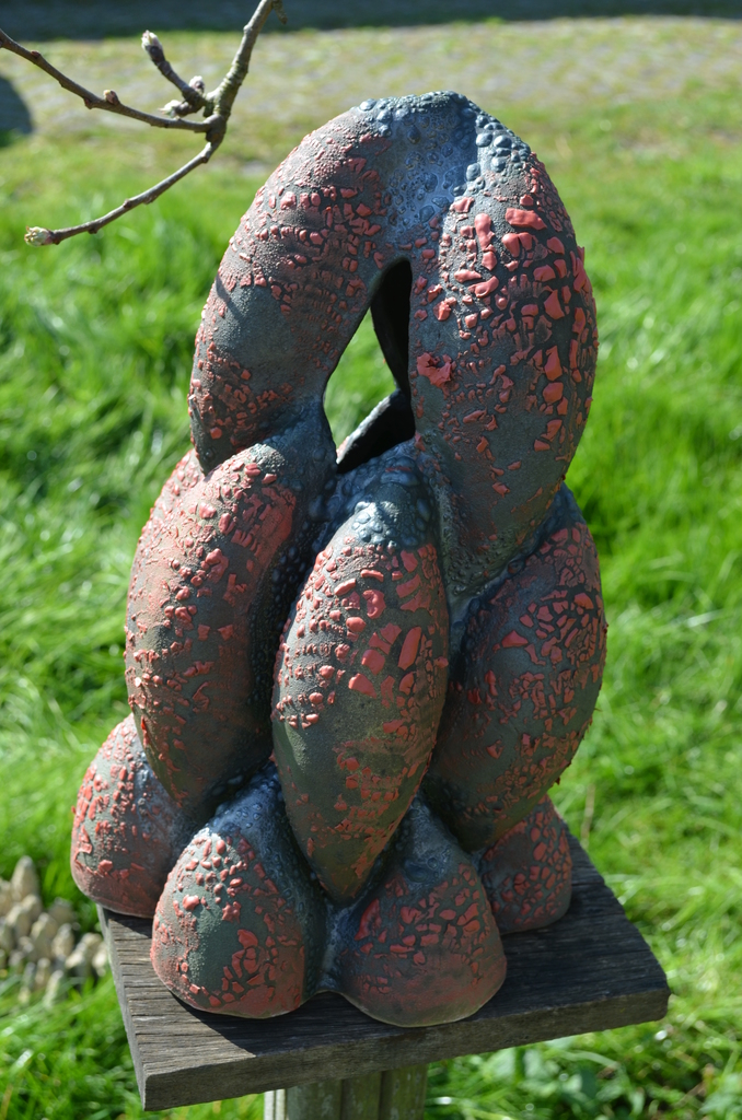uit de serie schelpen:opgebouwde schelpen met een driedimensionale opening, mat zwartgroene glazuur met in de gleuven speciale effecten van terugtrekkende glazuur. Koraal effect is verkregen door rode terugtrekkende glazuur. Gestookt op 1060 graden